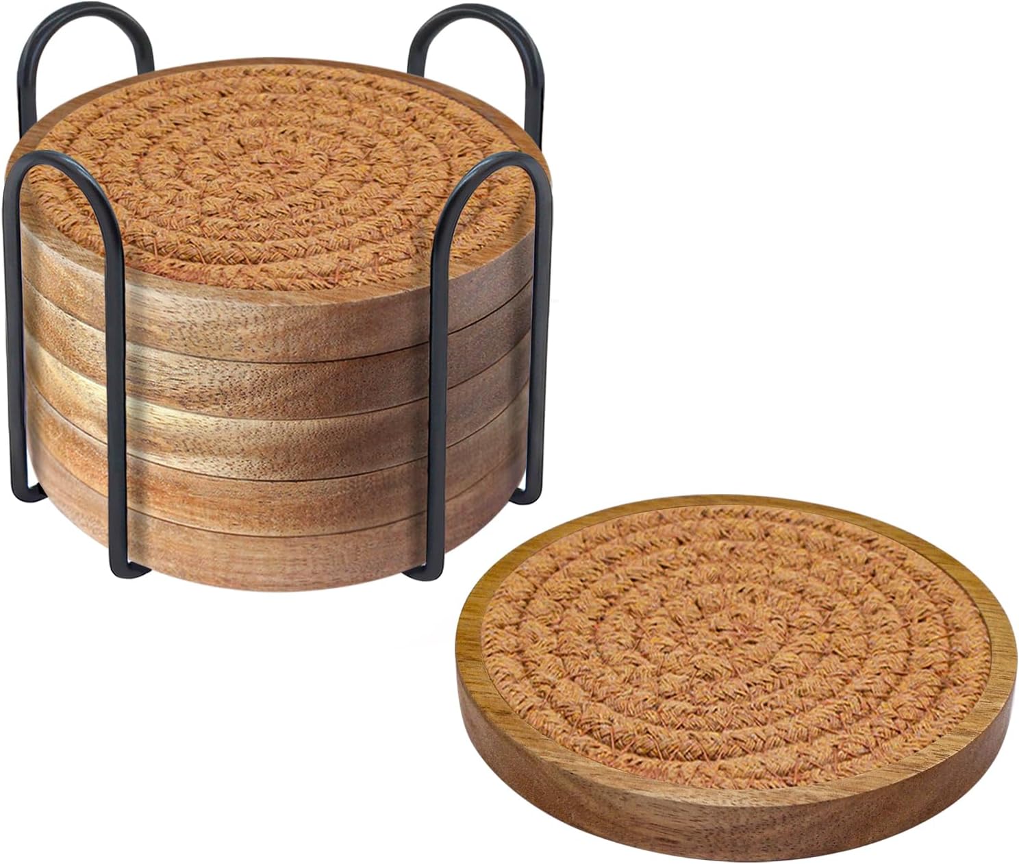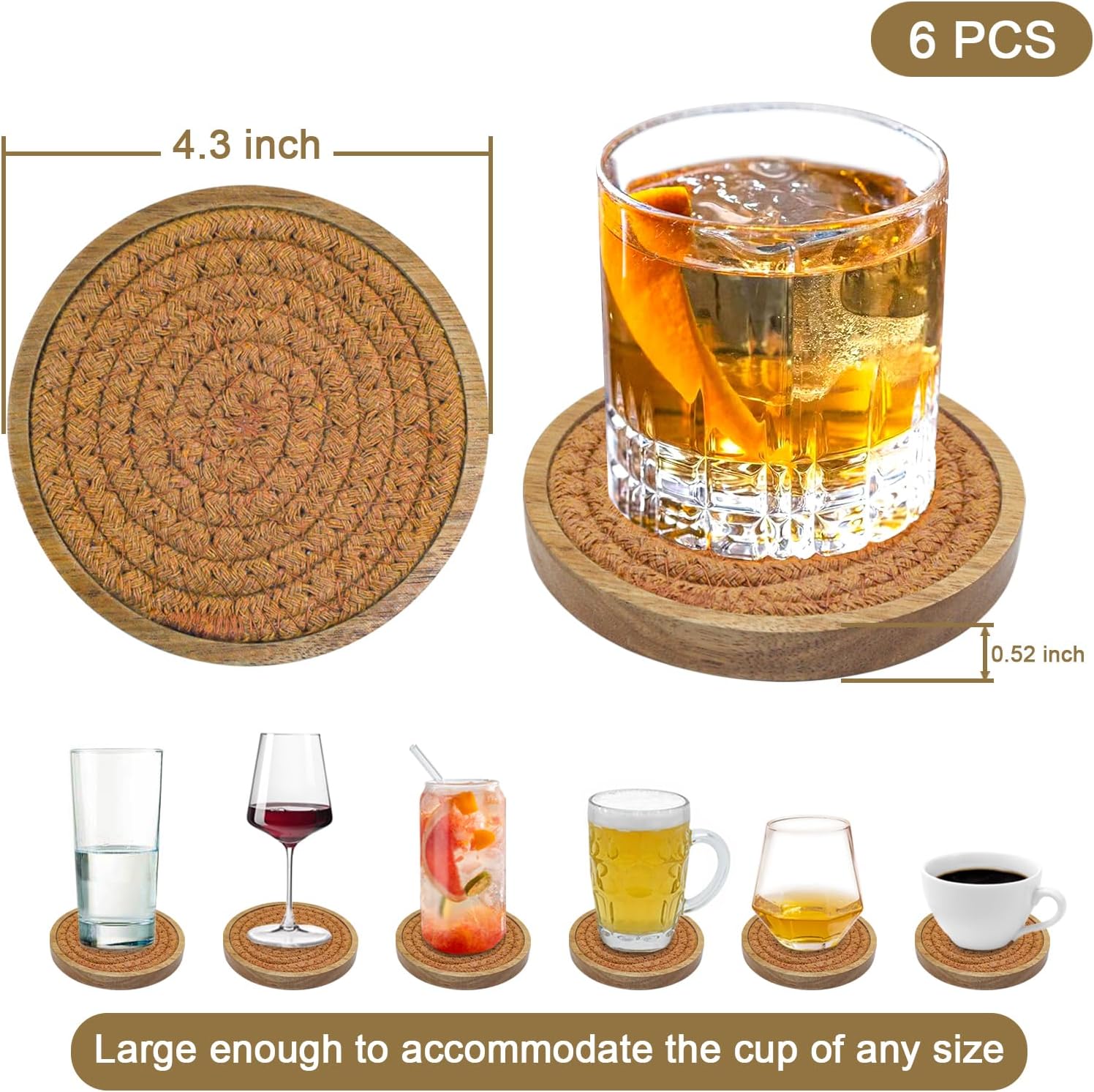 - 🍷Easy to Clean: Just get out the woven coasters, rinse coasters with water, and hang them up to dry; Diameter 4.3 inches, larger and thicker than other coasters, and fit for kinds of cups, reusable round coasters come with great gift packing bag, perfect for housewarming and kitchen gifts.