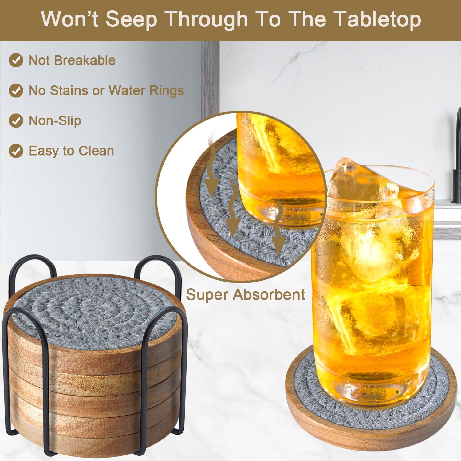 - 🍺Extra Absorbent Coasters: Large wood coasters inside made of cotton fabric that can absorb larger amounts of condensation and make sure moisture doesn't permeate on the table; keep the table dry in case it gets stains or water rings.