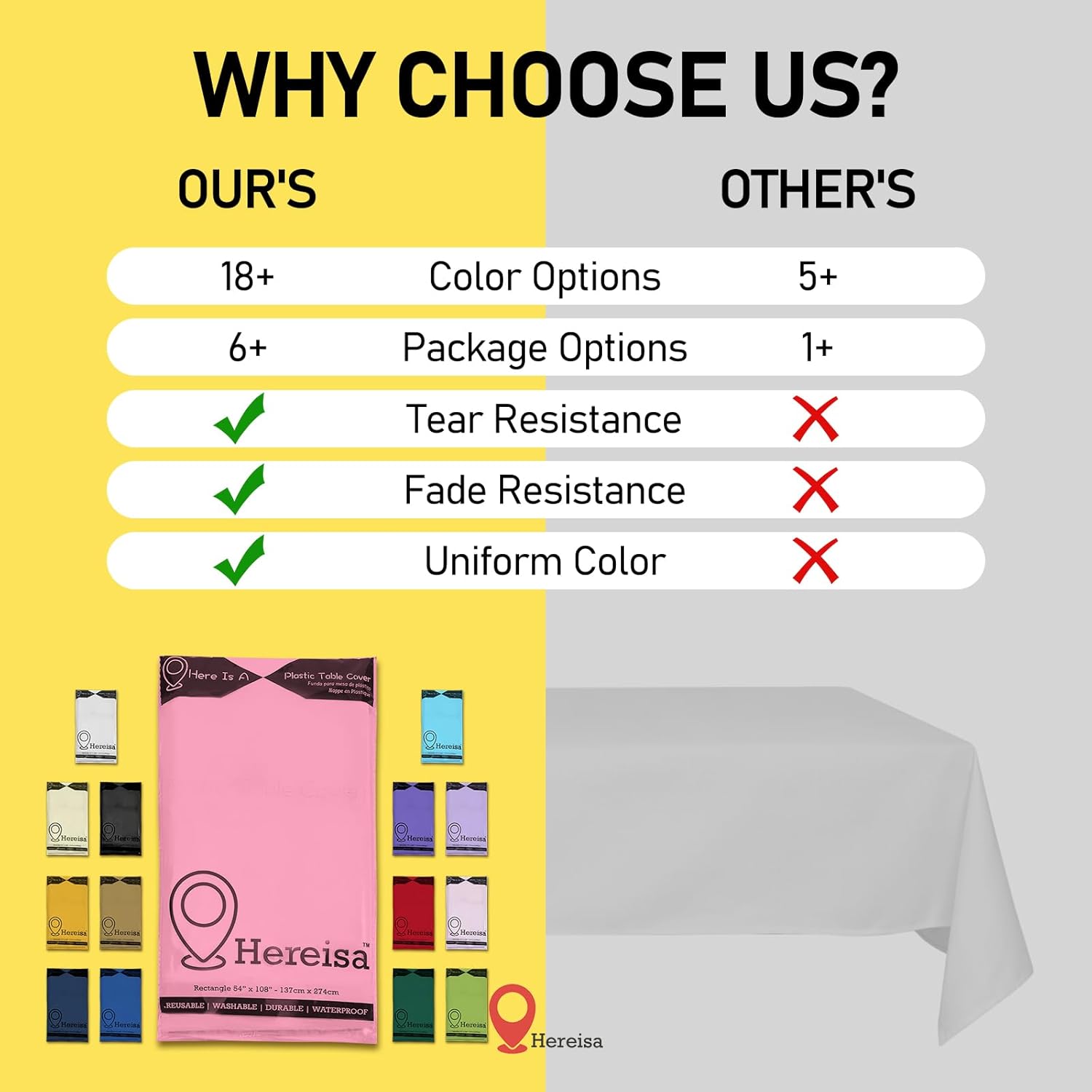 - [QUALITY ASSURANCE]: "HereIsA" Pink Plastic Tablecloth made of PEVA vinyl is chlorine free, plastic odor free, BPA Free, 100% food grade and children's safety. PEVA material do not expose your family and the environment to harmful chemical fumes. Enjoy your party time without worrying about the odor of unhealthy.