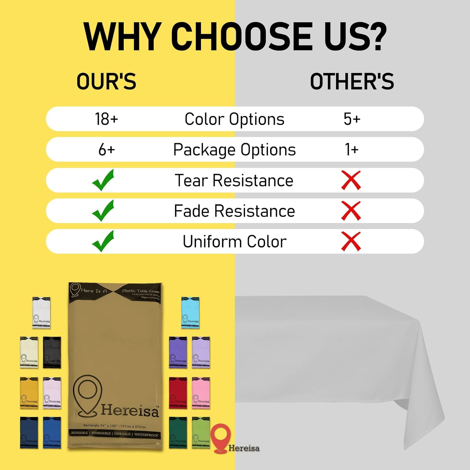 - [OVER 20 COLOR OPTIONS]: We have over 20 different colors of 54 Inch x 108 Inch Rectangular Plastic Table Cloth to meet your specific needs. Please feel free to choose your favoriate colorful combination for your specific event or party theme.