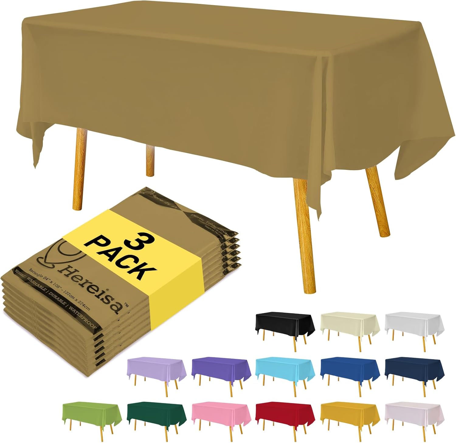 Plastic Gold Tablecloths 3 Pack Disposable Table Covers 54 x 108 Inch Golden Table Cloths for Fall Parties Harvest Graduations Anniversary Thanksgivings Weddings