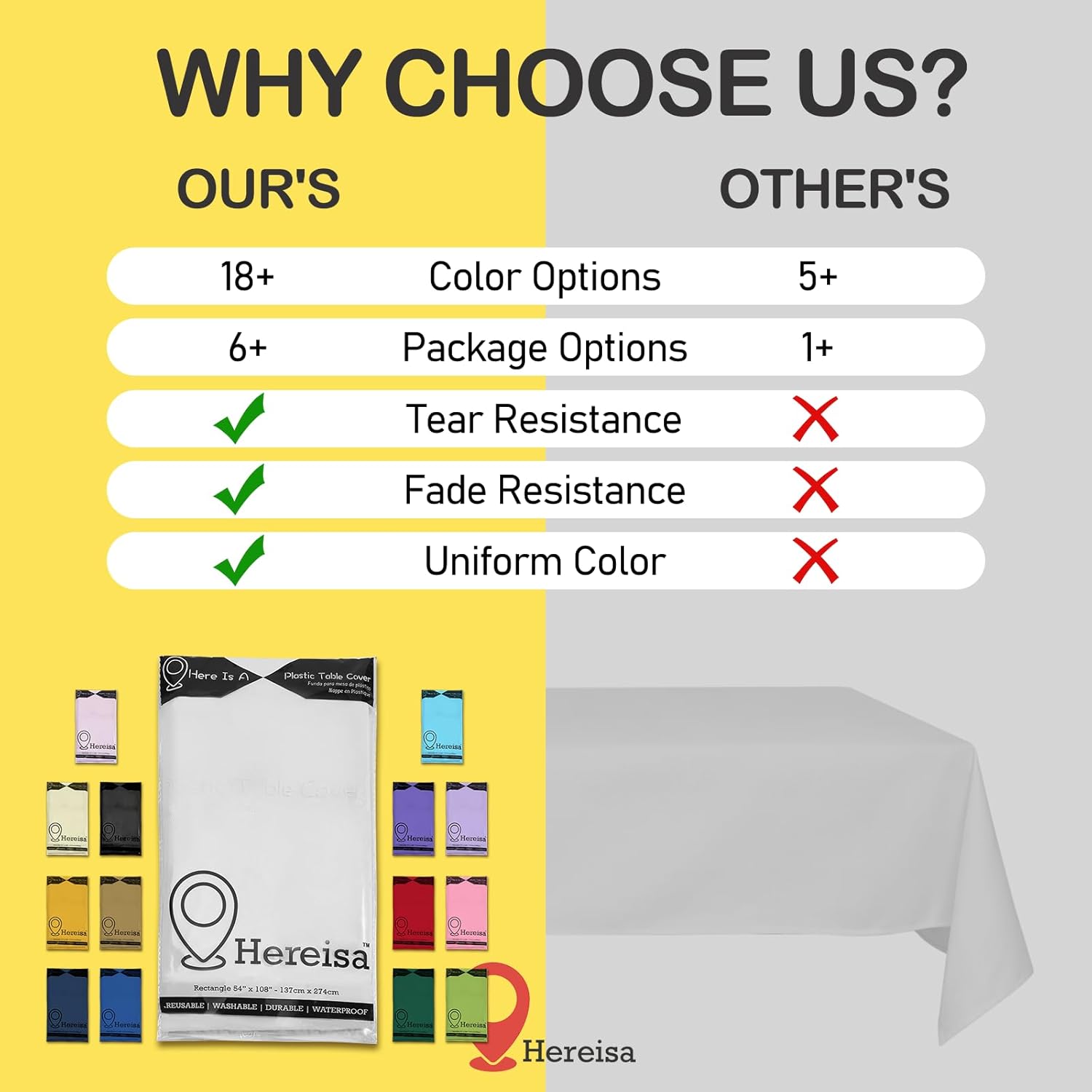 - [OVER 20 COLOR OPTIONS]: We have over 20 different colors of 54 Inch x 108 Inch Rectangular Plastic Table Cloth to meet your specific needs. Please feel free to choose your favoriate colorful combination for your specific event or party theme.