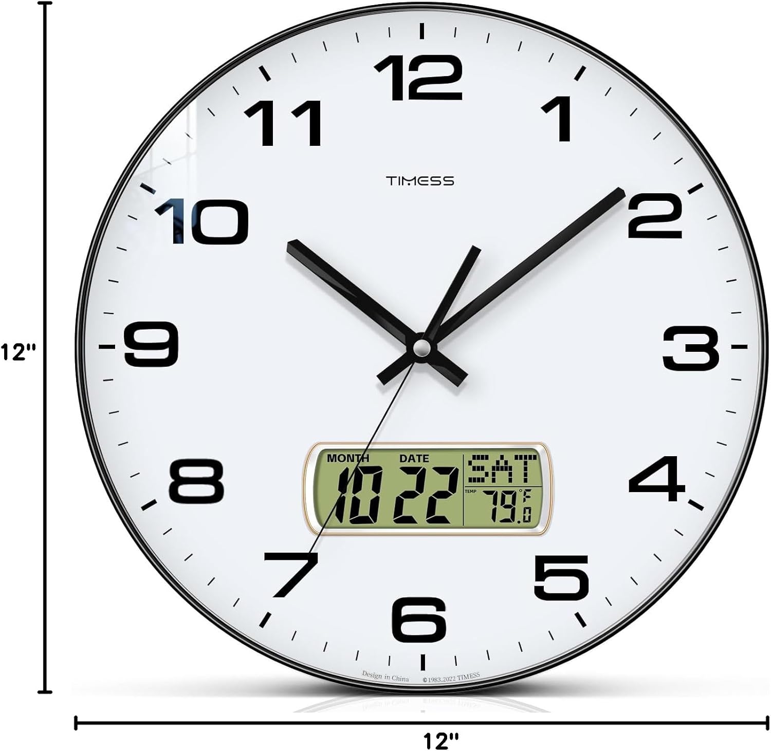 Wall Clock, 12" Dial Non-Ticking Silent Battery Operated Analog with LCD Display for Perpetual Calendar and F° Temperature, Ideal Modern Home, Bedroom, Kitchen, Office Decor (Black)