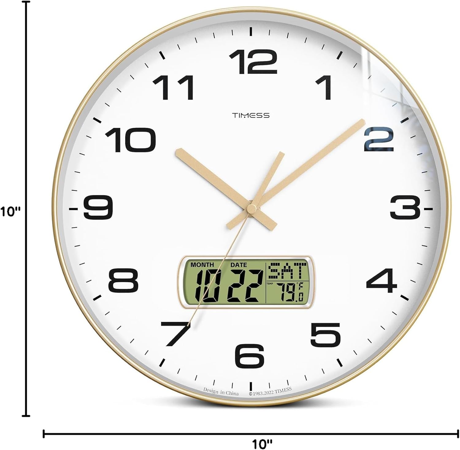 Wall Clock, 10" Dial Non-Ticking Silent Battery Operated Analog with LCD Display for Perpetual Calendar and F° Temperature, Ideal Modern Home, Bedroom, Kitchen, Office Decor (Gold)