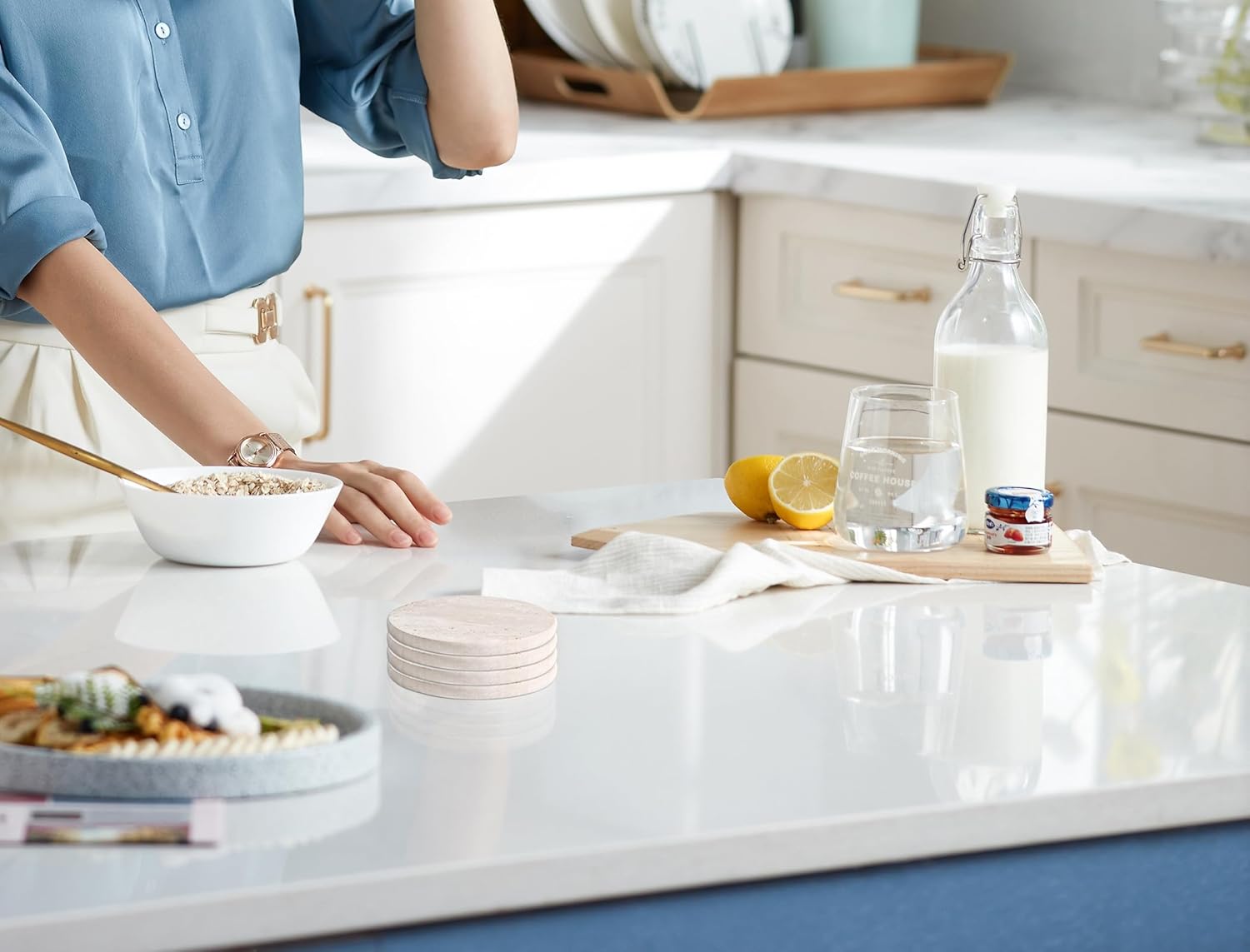 - 2. Natural Stone Coasters. Made from natural limestone with absorbent properties, each 4-inch coaster in this set of 4 is perfect for preventing drink rings on your furniture. The non-slip cork backing ensures that your coaster stays put, and its light beige color complements any interior design style. These versatile coasters are perfect for gifting during the holiday season.