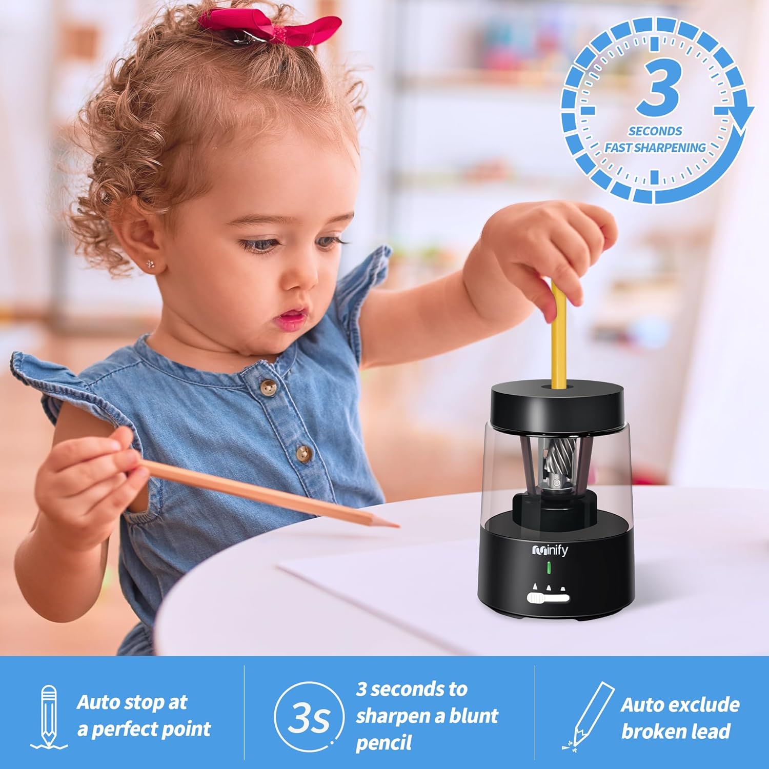 - Auto Stop and Fast Pencil Sharpener: Minify Electric Pencil Sharpener can sharpen a new pencil in five seconds, and sharpen a blunt pencil in three seconds. The Pencil Sharpener will auto stop when it sharpen at a great point. Just insert the pencil and it will automatically stop when sharpened