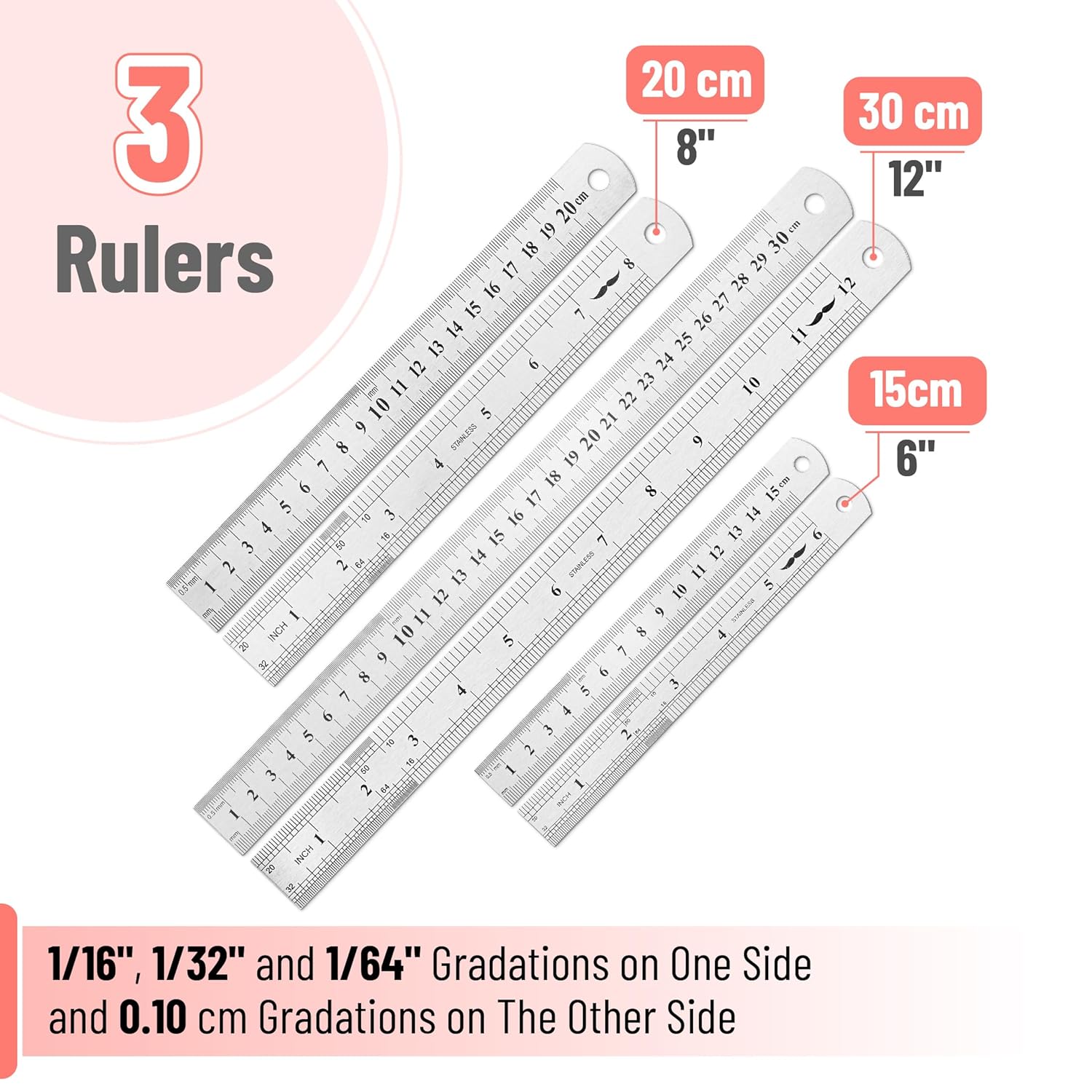 Mr. Pen- Stainless Steel Rulers, 3 pcs, 6", 8" & 12", 6 Inch Ruler Metal Rulers, Small Metal Ruler 6 Inch Metal Ruler Thin Flat, Stainless Steel Ruler 12 Inch, Centimeter Ruler, Steel Ruler 12 Inch