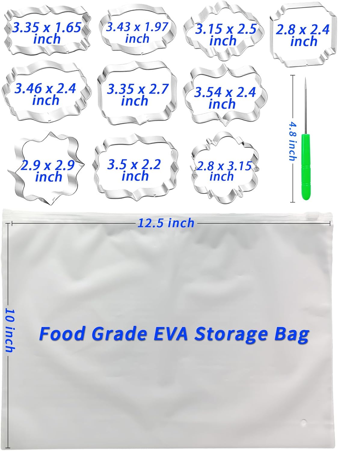 - ă10 Frame Shapes Cutteră: There are 10 different shapes of cookie cutters, which are made of Food-grade 430 Stainless Steel, sturdy and easy to clean.