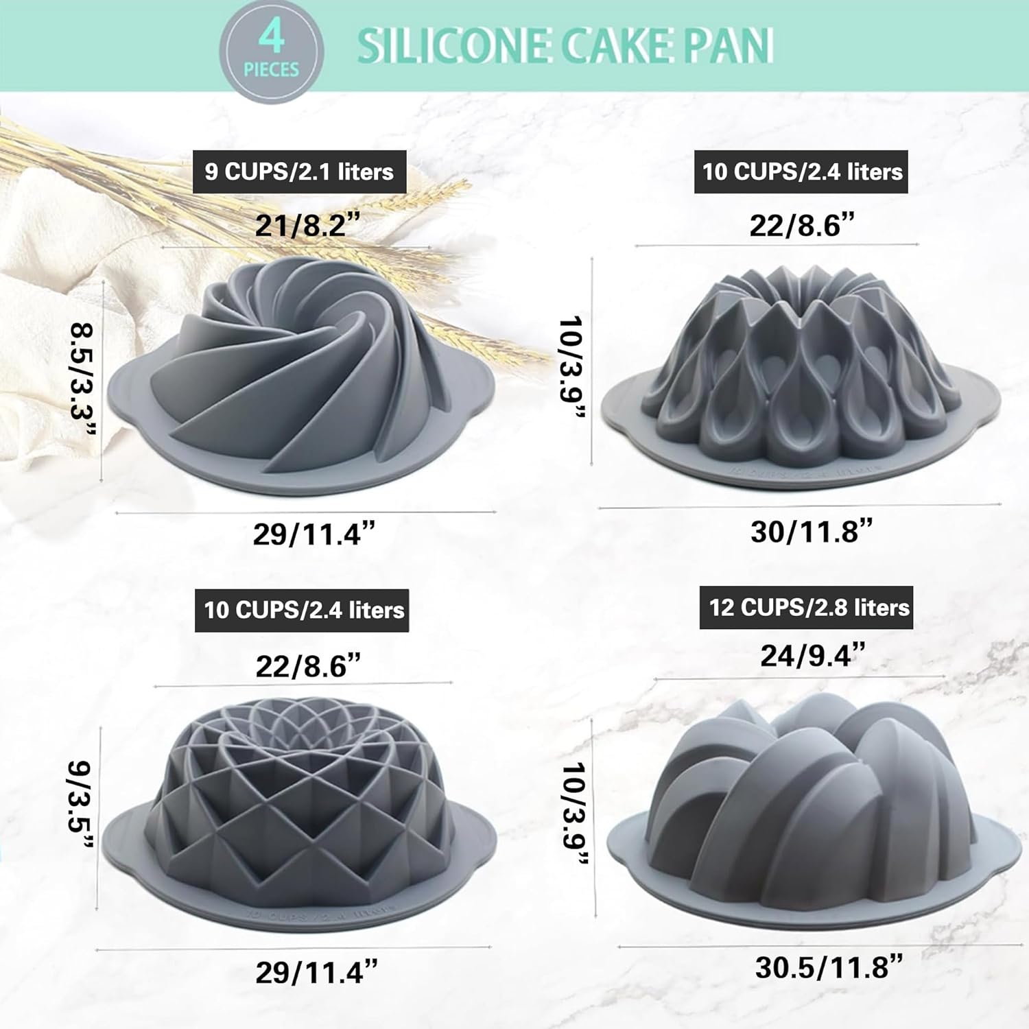 Tongjude 4 Pieces Silicone Fluted Cake Pans, 9/10/12 Cups Tube Baking Pan, Silicone Molds for Homemade Cake, Bread and Jello, Non-Stick, Grey