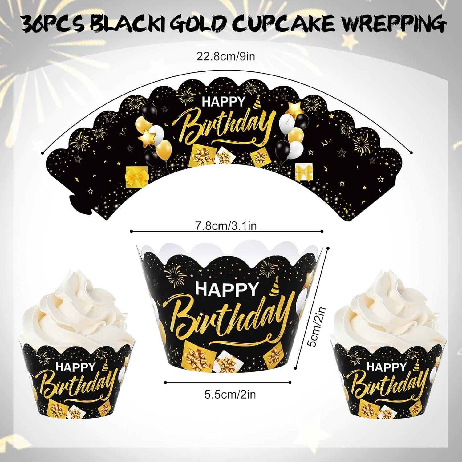Whaline 36Pcs Happy Birthday Cupcake Wrappers Black Gold Birthday Cupcake Liners Decorative Cupcake Holders for Baby Shower Birthdays Party Cake Decoration