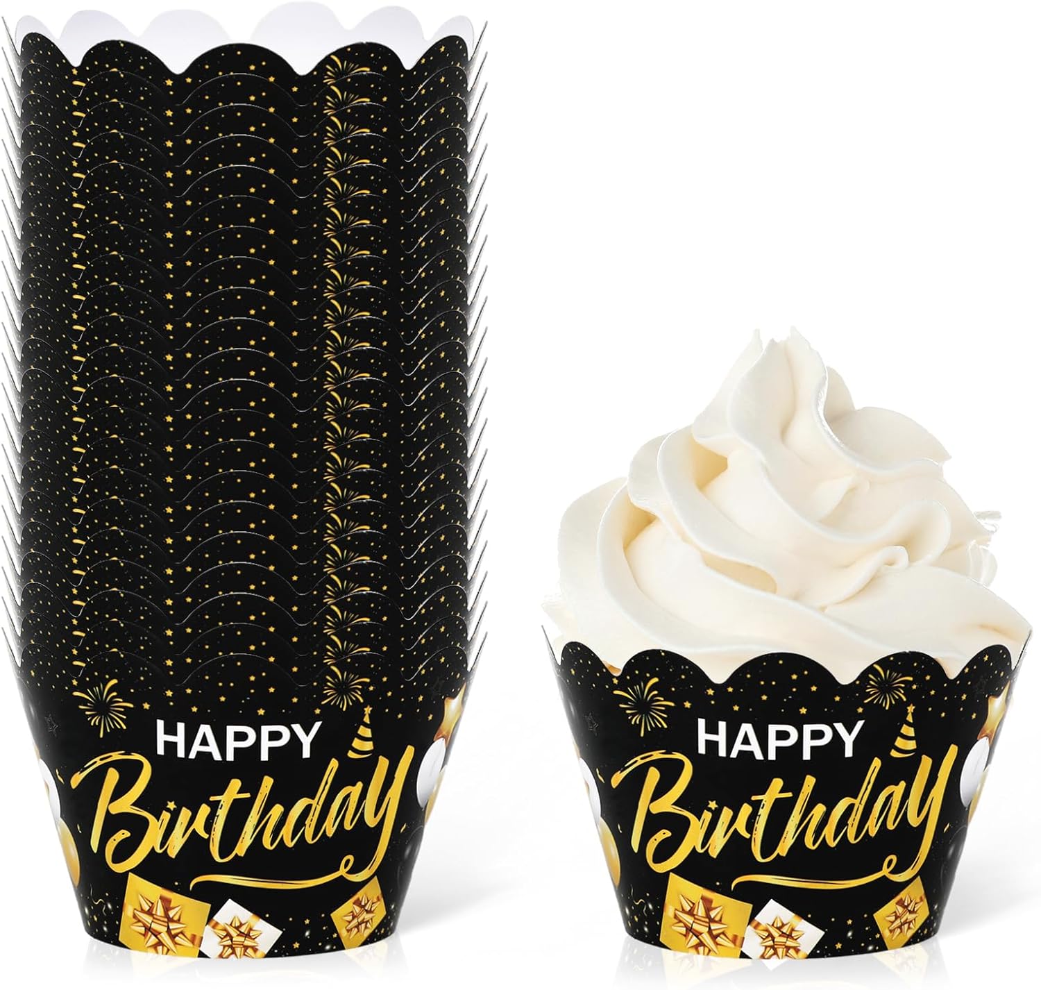 - Birthday Design - Our cupcake liners are mainly in black and gold colors, they are printed with balloons, stars, fireworks, etc., and letter Happy Birthday, perfect for celebration, add a cheerful atmosphere.