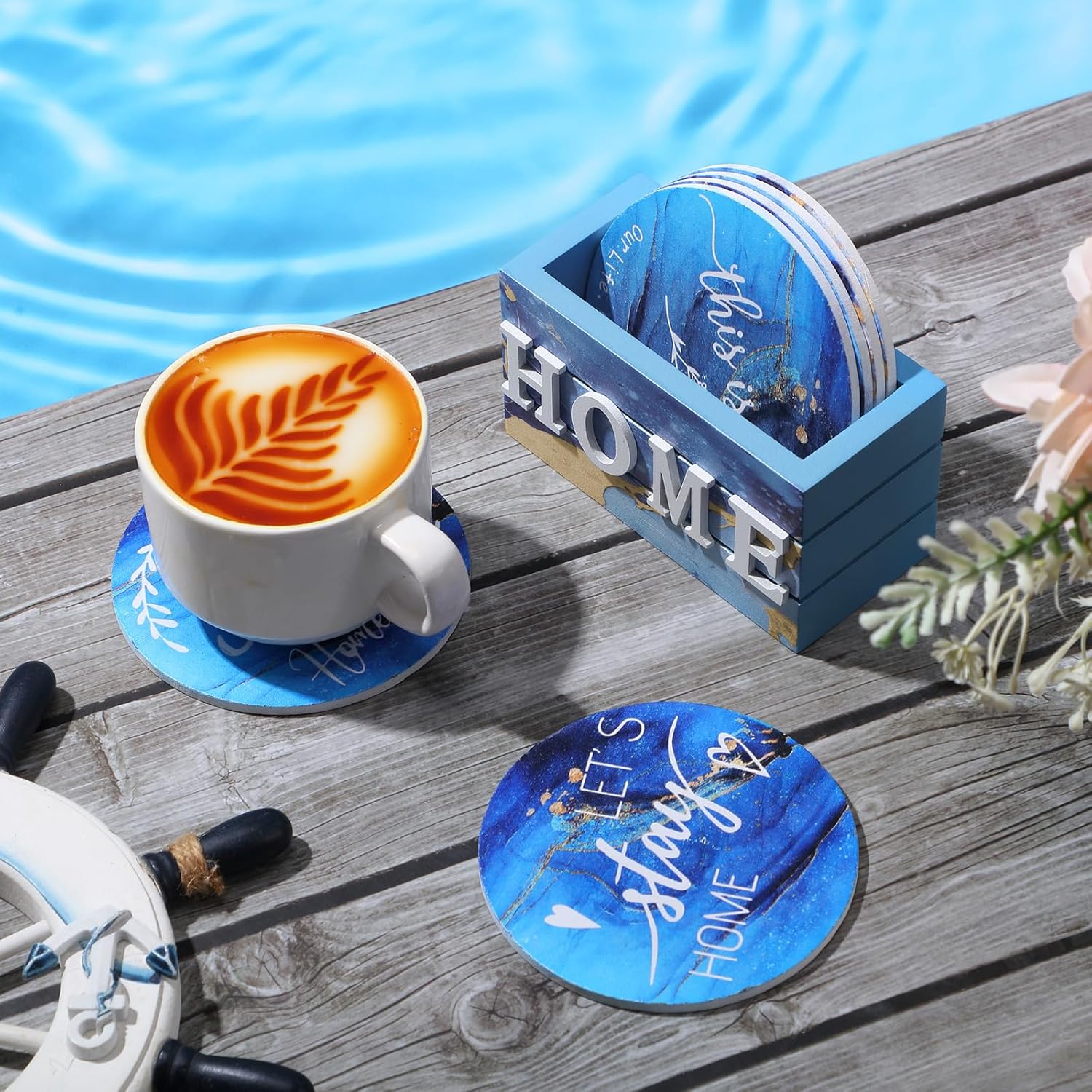 Queekay Housewarming Gifts for Home Decoration Wooden Heart Coasters for Drinks 6 Set Farmhouse Coasters with Holder Funny for Family Coffee Table Protection, 4''(Gilded Blue)