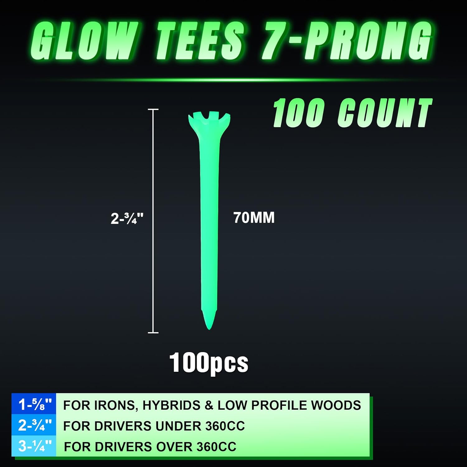 - Glow Tee System: Comes in 12 count 7-Prong 70mm(2-3/4 ") glow tee lengths, ensuring a perfect fit for drivers under 360CC.