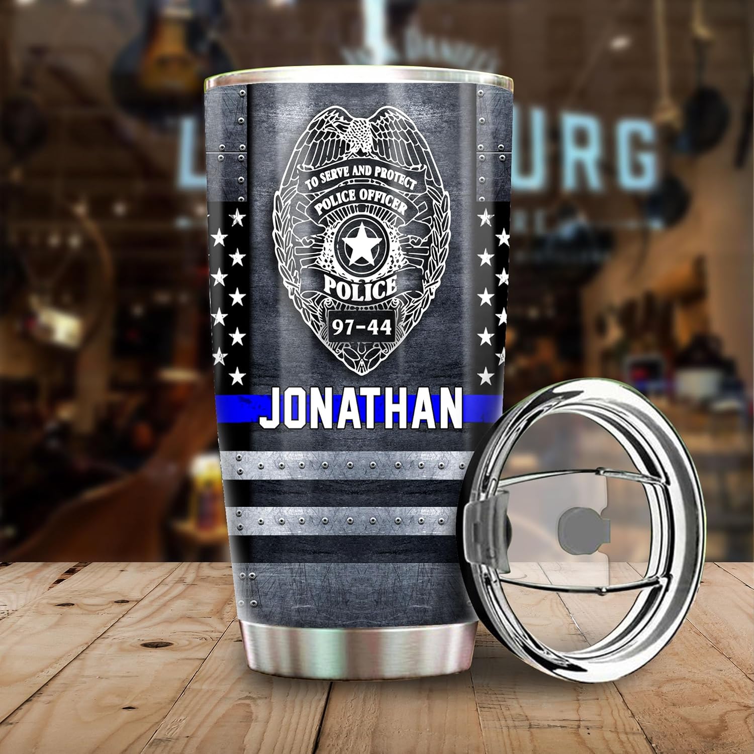 Police Officer Gifts - Custom Name Badge Number Thin Blue Line Lives Matter Flag Tumbler - Police Academy Graduation Retirement Birthday Gifts - 20oz Tumbler With Lid