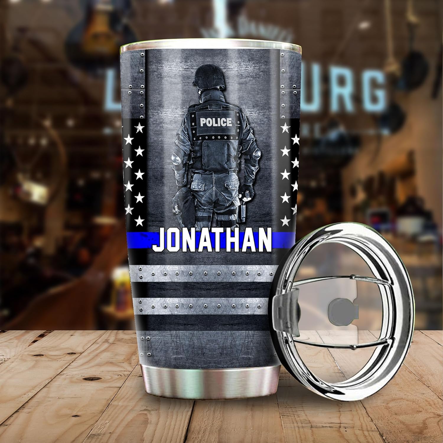 Policeman Police Officer Gifts - Custom Name Badge Number Thin Blue Line Lives Matter Flag Tumbler - Police Academy Graduation Retirement Birthday Gifts - 20oz Tumbler With Lid