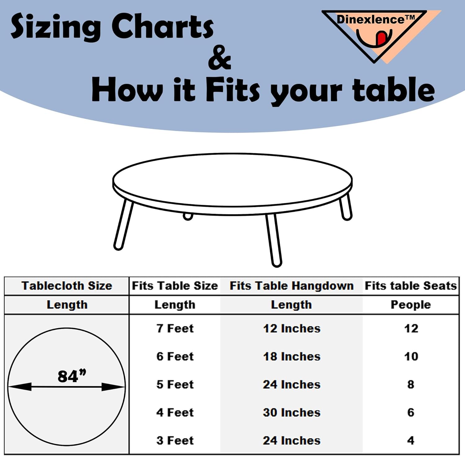- ā **PERFECT FIT & MULTIPLE USE** 84" Round table cover fits almost all common round table you can have, one size fits all. From kitchen to celebration, from dining to party, from indoor to outdoor, wherever your table is, our versatile tablecloths bring a touch of elegance that complements any location. Dining, Party, Outdoor Gatherings, Wedding, Anniversary, Graduation, Baby shower, Christmas... You name it, we cover it.