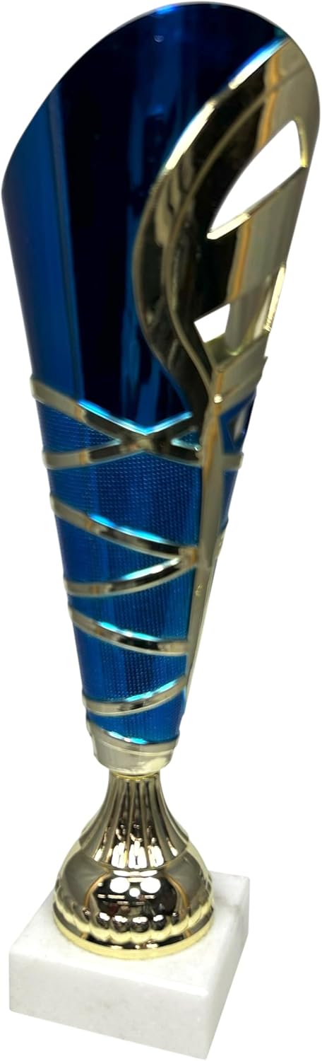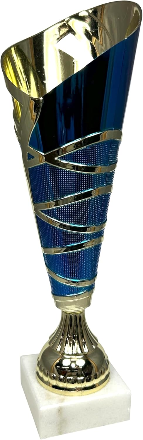 - CHAMPION AWARD CUP: This is a Large 13 inches Tall Gold and Metallic Blue Color Tournament Champion Trophy Recognition Award cup.