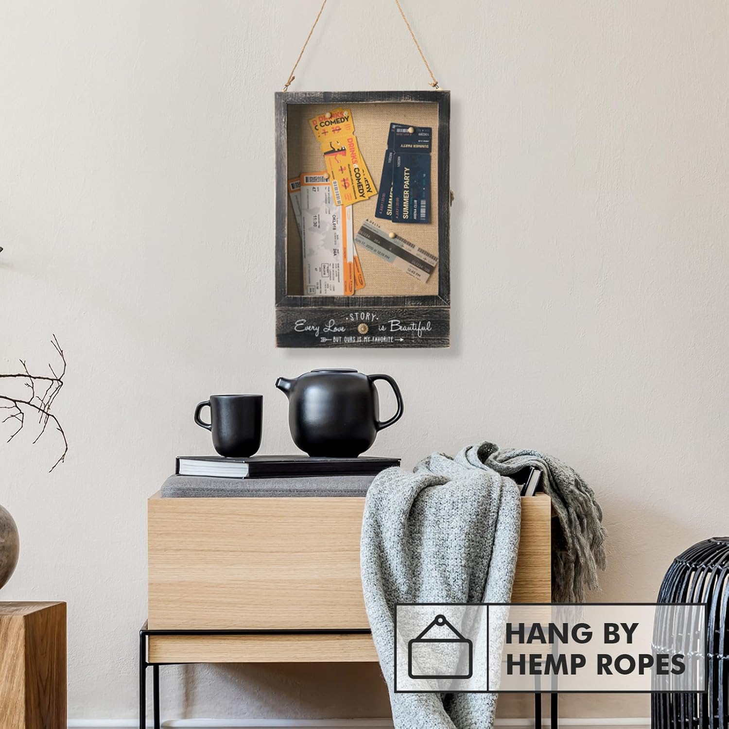 - 【RETRO DESIGN】The original wood grain & jute woven lining & retro lock & woven hemp rope make this rustic picture frame more retro; the drawers are also printed with exquisite patterns:" Every love story is beautiful, but ours is my favorite". The deep shadow box has two detachable partitions, and there is also a slot on the top to put collectibles