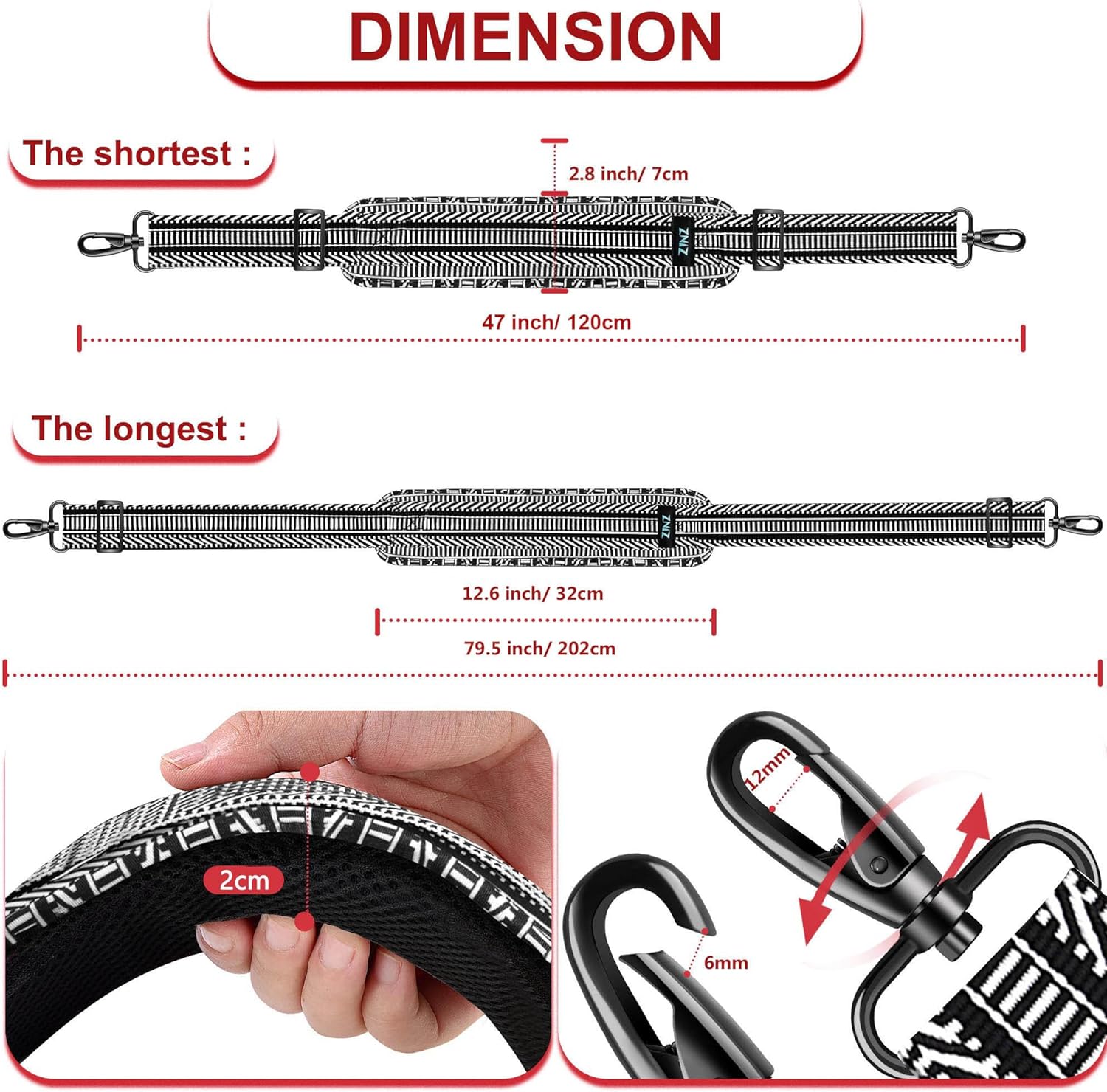 - Adjustable - The shoulder strap can be adjusted between 44 inch to 79.5 inch (112 cm to 202 cm) in length, 1.5 inch in width. Pad Length: 12.6 inch and Width: 2.8 inch. The easy adjustment in length allows for the perfect fit. suitable for people whose height is between 1.5 meters and 2.4