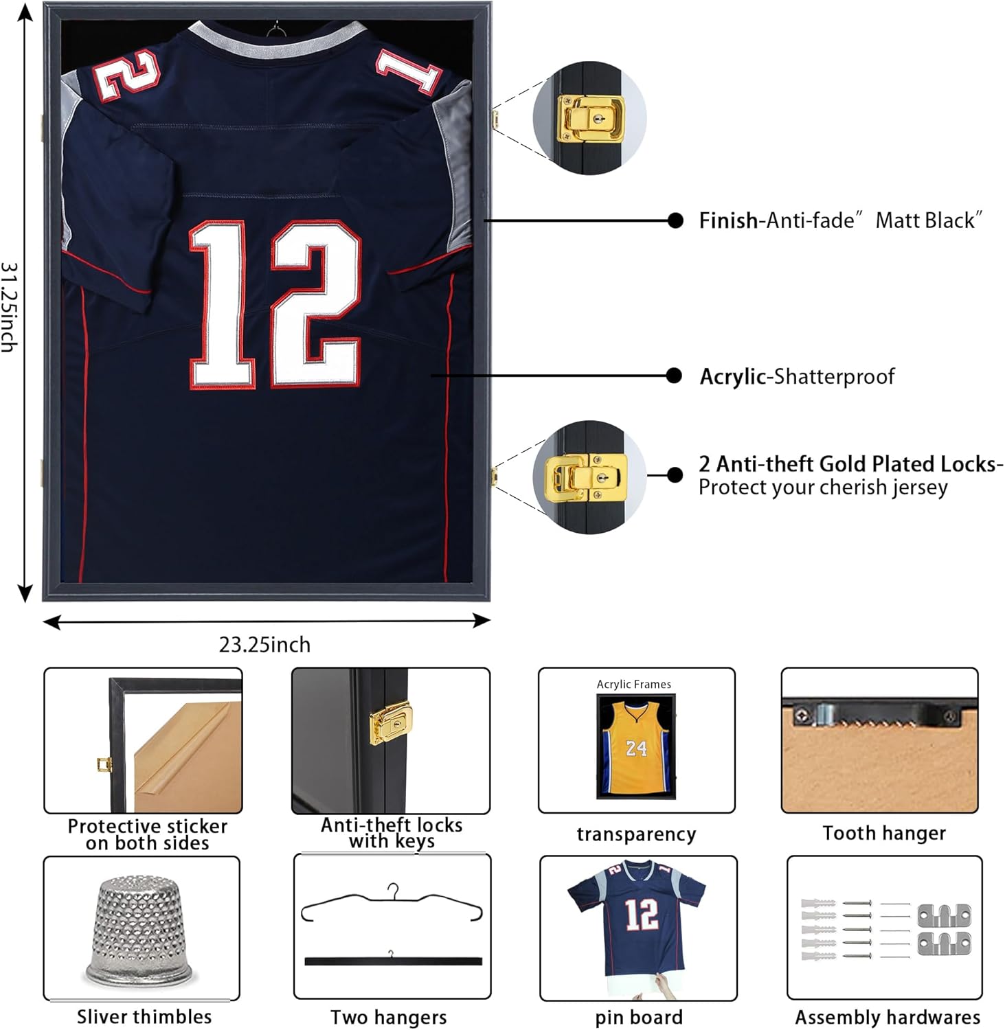 - PROTECT YOUR PRECIOUS JERSEY - The shatter proof acrylic board features in UV protection and high transparency, which protects your jersey from fading and keeps out dust. One pair of gold plated and anti-theft locks on the frame provide extra protection. They will not turn yellow over time.