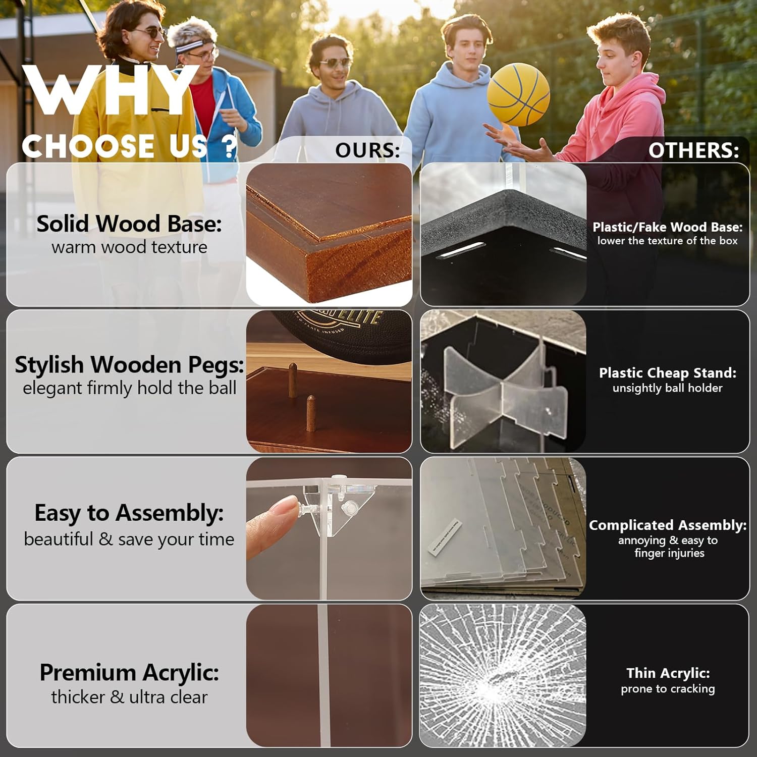 - Superior Material Excellence: Revel in the premium quality of our clear display box, constructed from high-grade materials. The thick acrylic shield safeguards your basketball from dust and UV rays, preventing fading and maintaining its pristine condition. The clarity of the acrylic ensures an unobstructed view, while the solid wood base offers a stable and elegant platform for your cherished memorabilia.