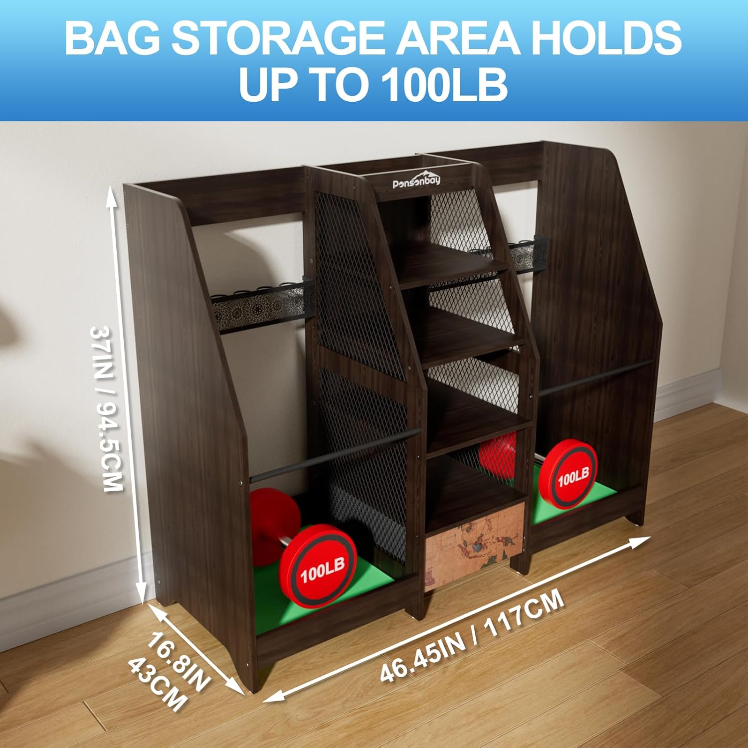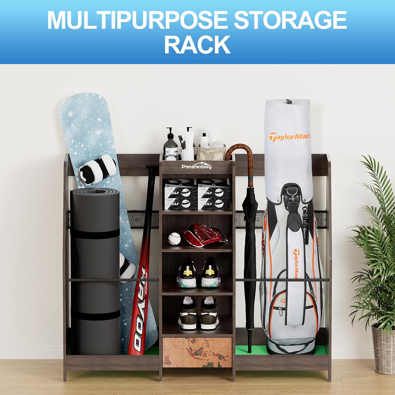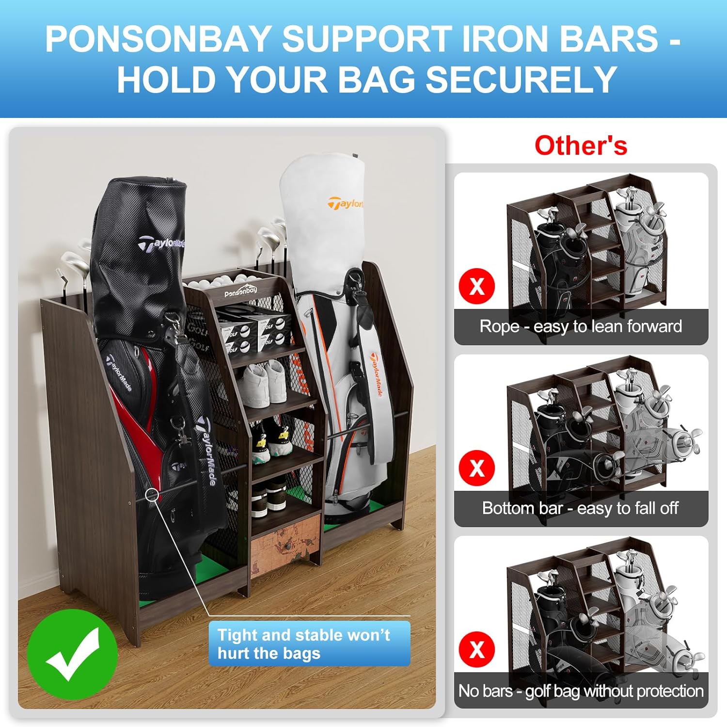 - High Storage Capacity: Ponsonbay golf bag storage rack is the most spacious rack on the Amazon market. It can hold 2 x golf bags, 12 x clubs, 4 x shoes, 50 + golf balls, many golf apparel, gloves, and hats