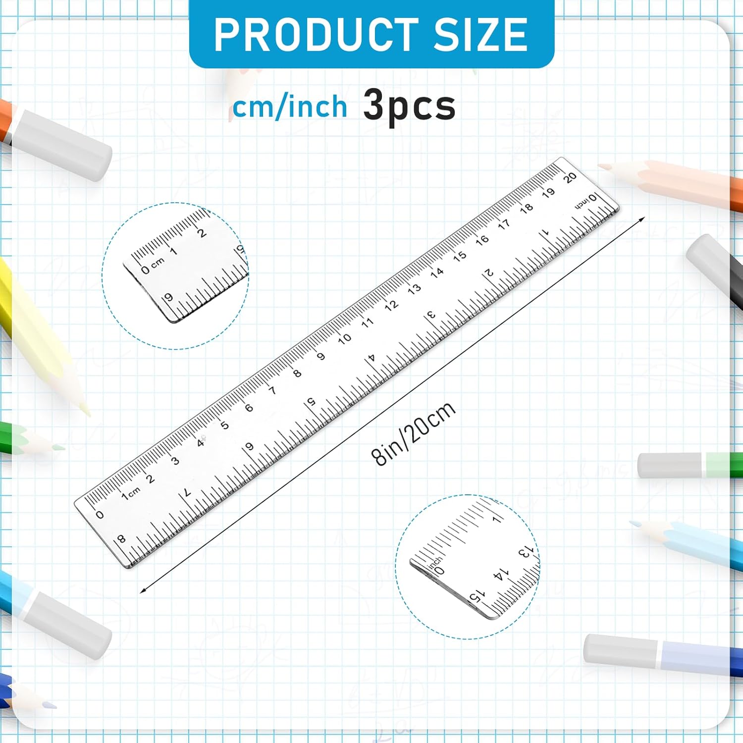 3 Pack 8 Inch Ruler Set Plastic Straight Ruler Transparent Measuring Tool Acrylic Clear Ruler for School Office Student(Transparent)