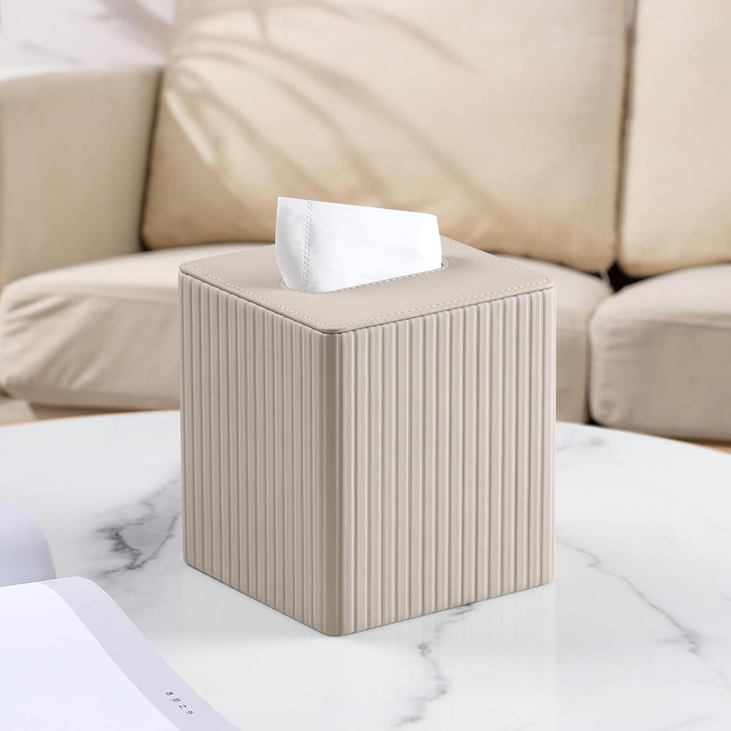 PU Leather Tissue Box Cover Square Tissue Box Holder with Magnetic Closure (Beige Stripe)