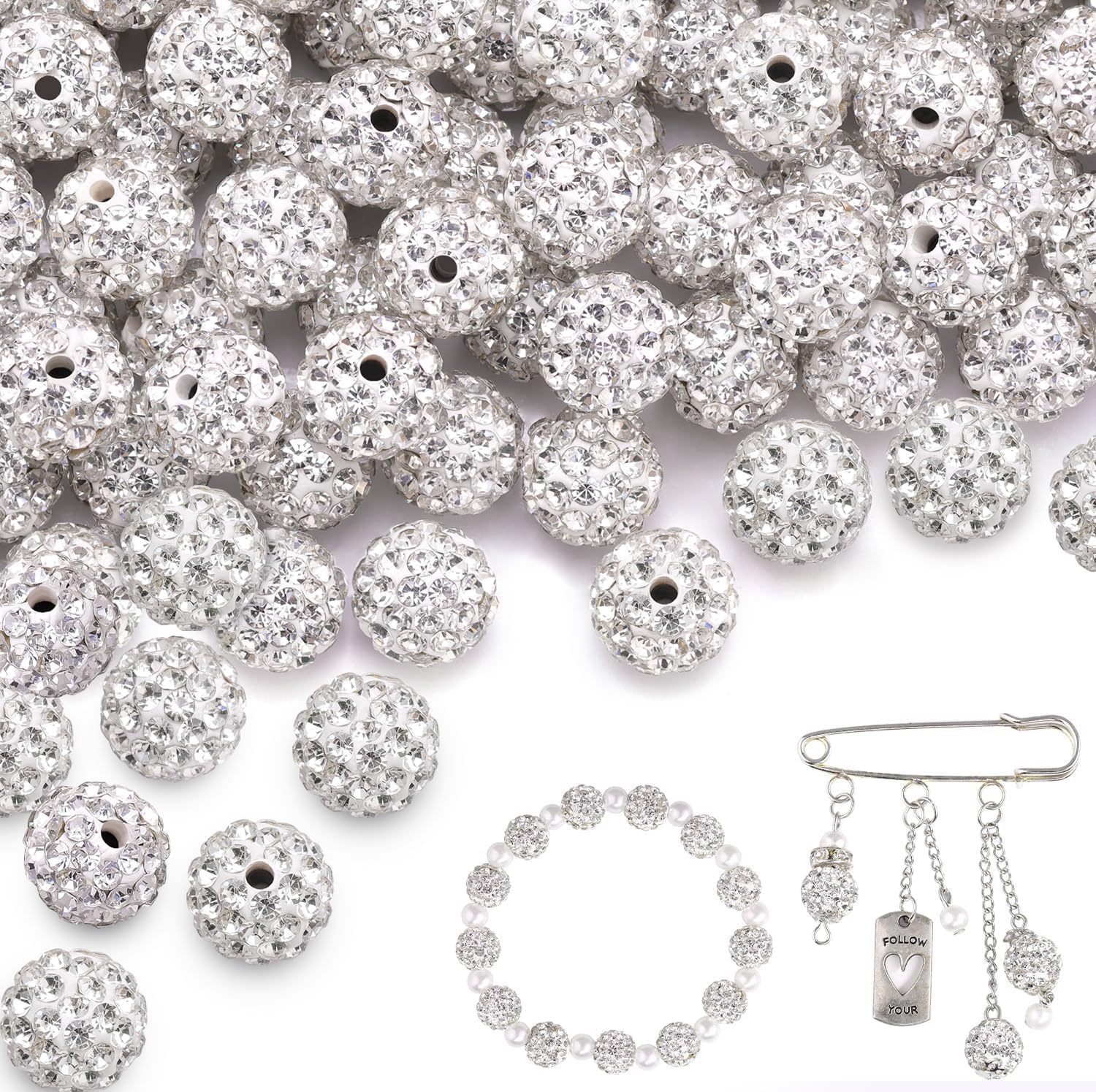 150 pcs 10mm Rhinestone Beads for Jewelry Making, White Shiny Round Shamballa Disco Beads Bulk, Sparkle Crystal Clay Christmas for Bracelet Baseball Necklace Earring Crafting and DIY