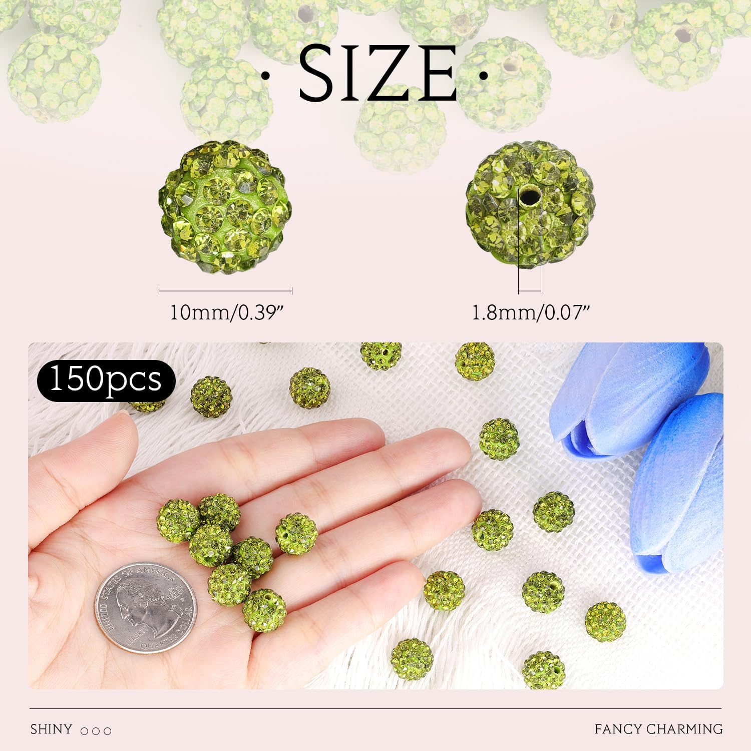 150 pcs 10mm Rhinestone Beads for Jewelry Making, Olivine Shiny Round Shamballa Disco Beads Bulk, Sparkle Crystal Clay Christmas for Bracelet Baseball Necklace Earring Crafting and DIY