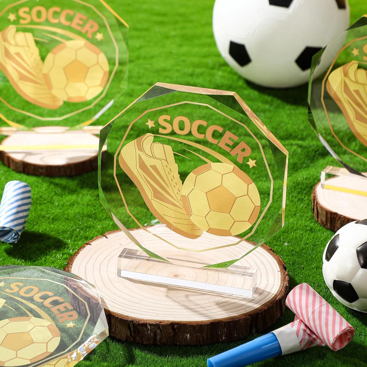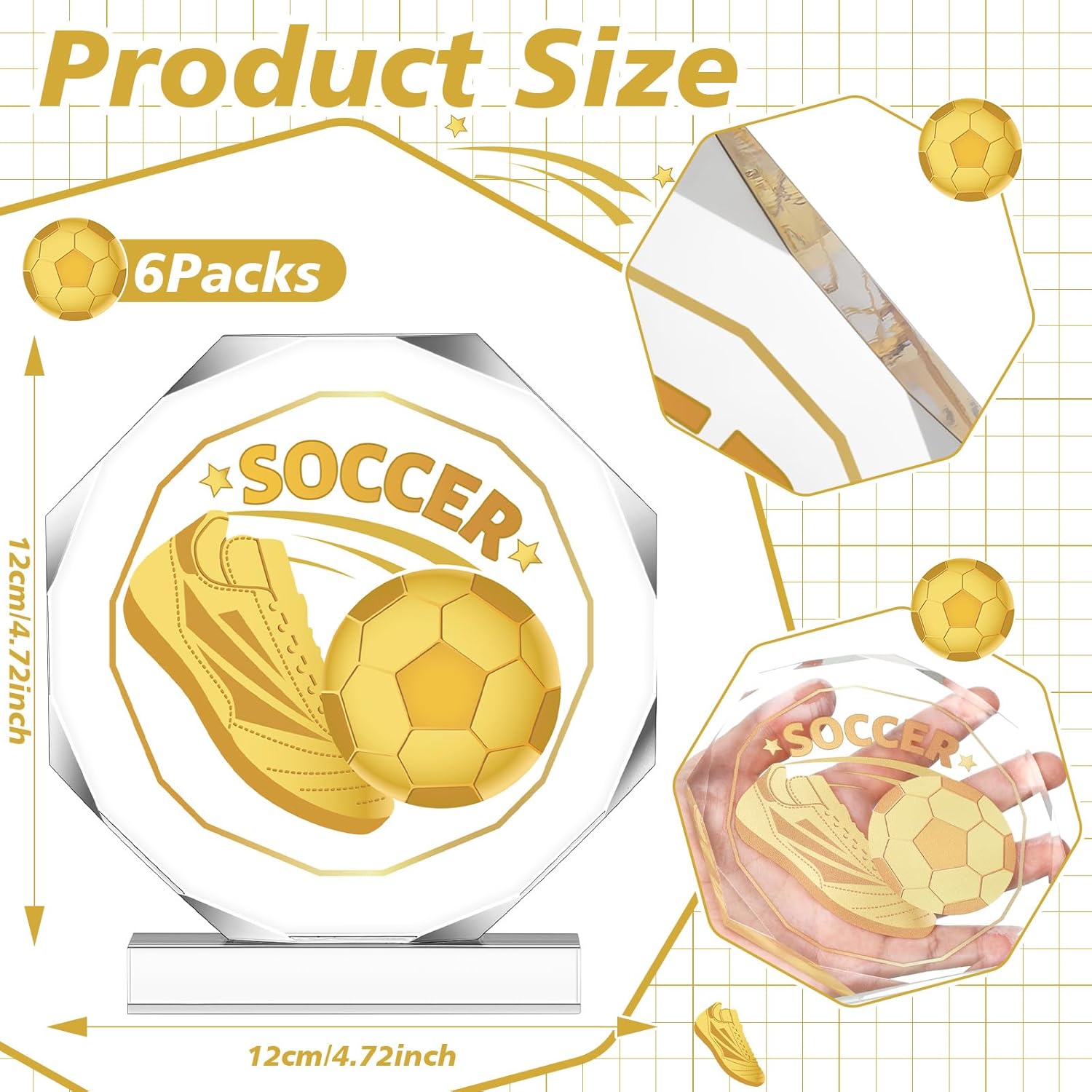 - Appropriate Size: with dimensions of 4.72 x 4.72 inches, the compact size of the soccer medal makes it easy to handle and display; Despite the size, it stands with a robust demeanor, highlighting its sturdy build, which is a result of its quality acrylic construct; The size of base plate is about 3.54 x 0.59 inches