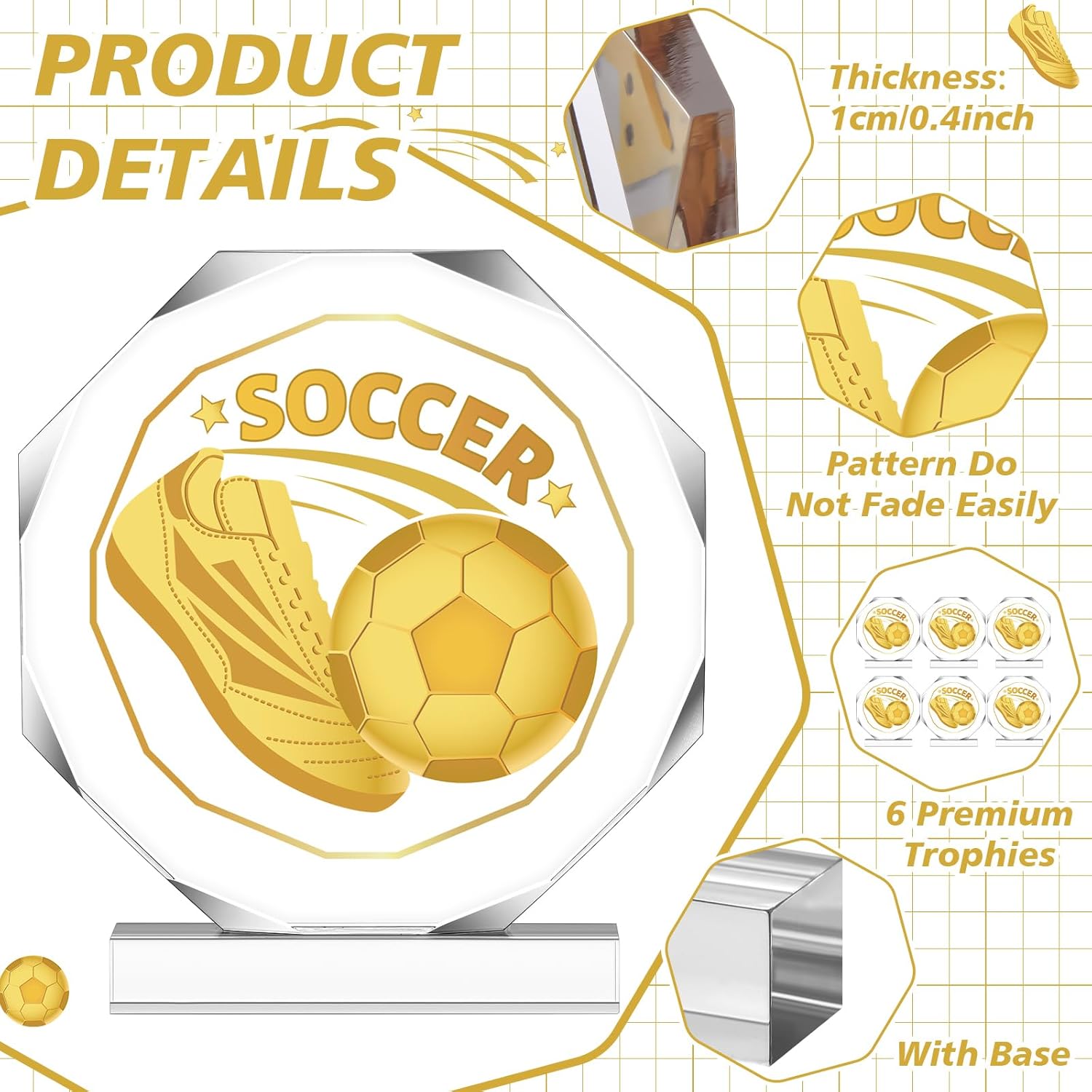 - You Will Receive: 6 soccer trophies; This set of 6 is appropriate for honoring the entire team or giving recognition to individual participants; Elegantly crafted, these trophies would become cherished keepsakes to remember a victorious season for years to come