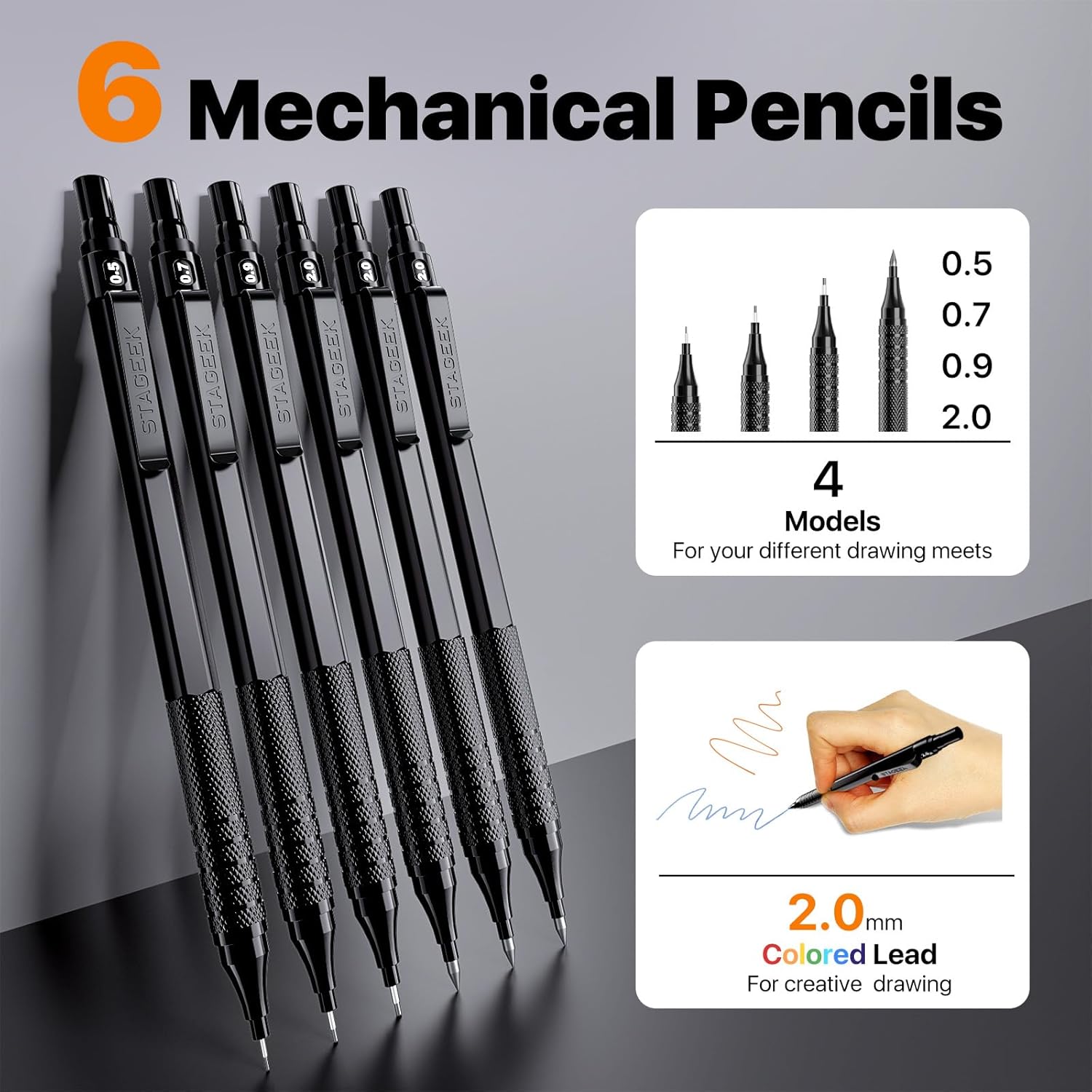 - 【Back-to-School Supplies Set】Prepare for the semester with the Stageek Metal Mechanical Pencil Set. This set includes 6 metal pencils, 384 graphite and colored leads, assorted erasers, a sharpener, and a protective case. It supports tasks such as sketching, writing, note-taking, drafting, and architectural drawing, and serves students, teachers, artists, professionals, engineers, technicians, and CAD draftsmen. A complete set for school, holiday, or office use.