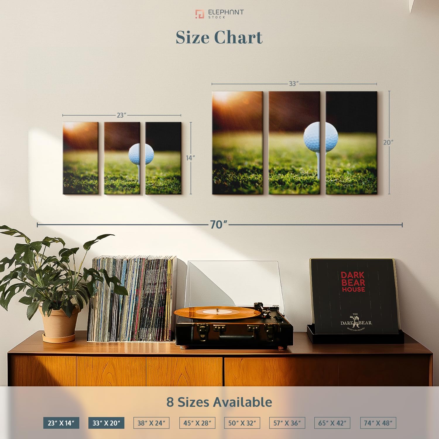 ElephantStock Golf Ball Tee Wall Art - Horizontal Canvas - 3-Piece Living Room Wall Decor - Photography Photographic Canvas Print - Black and White Decor for Wall - 23" X 14"