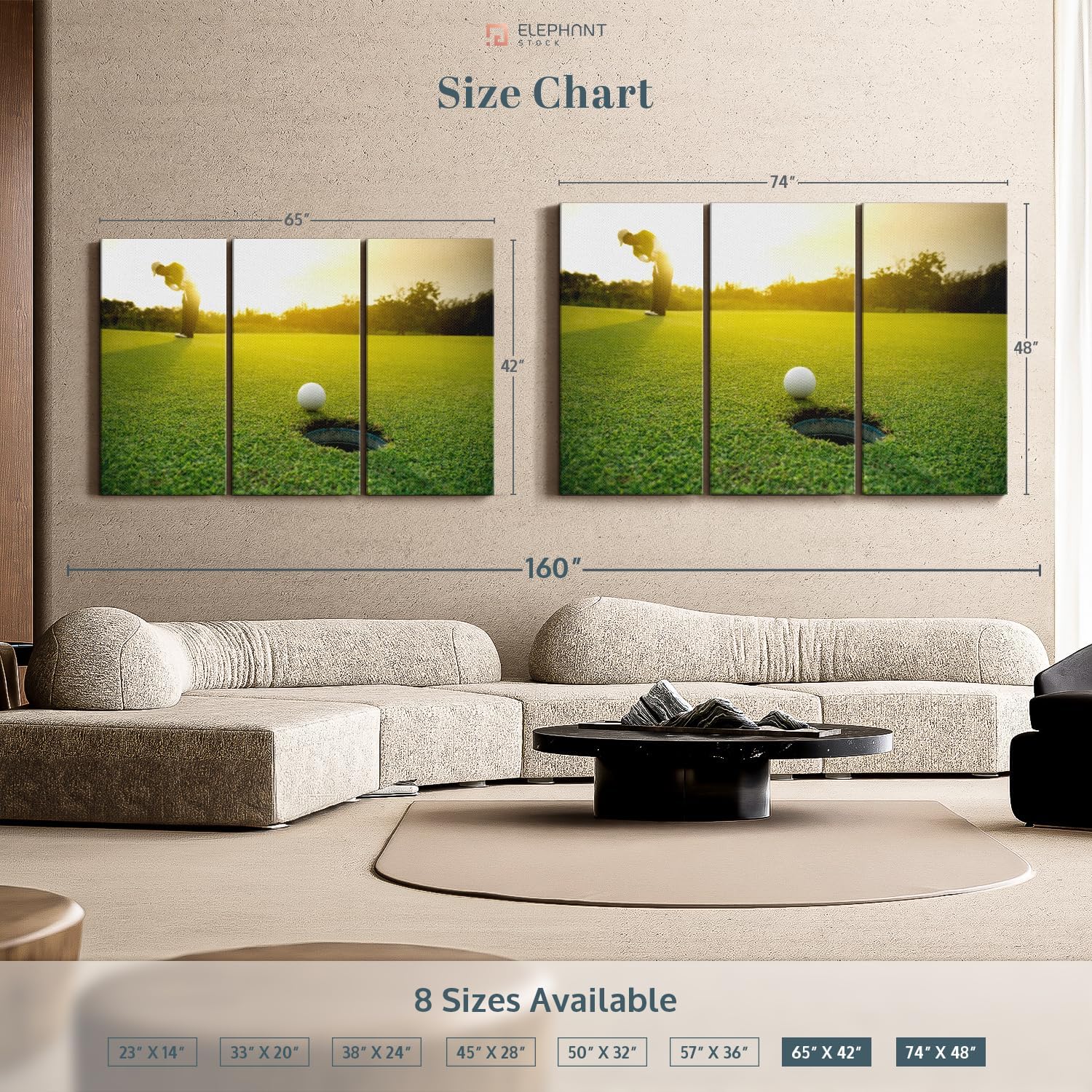 ElephantStock Golf Ball Strike Wall Art - Horizontal Canvas - 3-Piece Living Room Wall Decor - Photography Sports Canvas Print - Green and White Decor for Wall - 65" X 42"