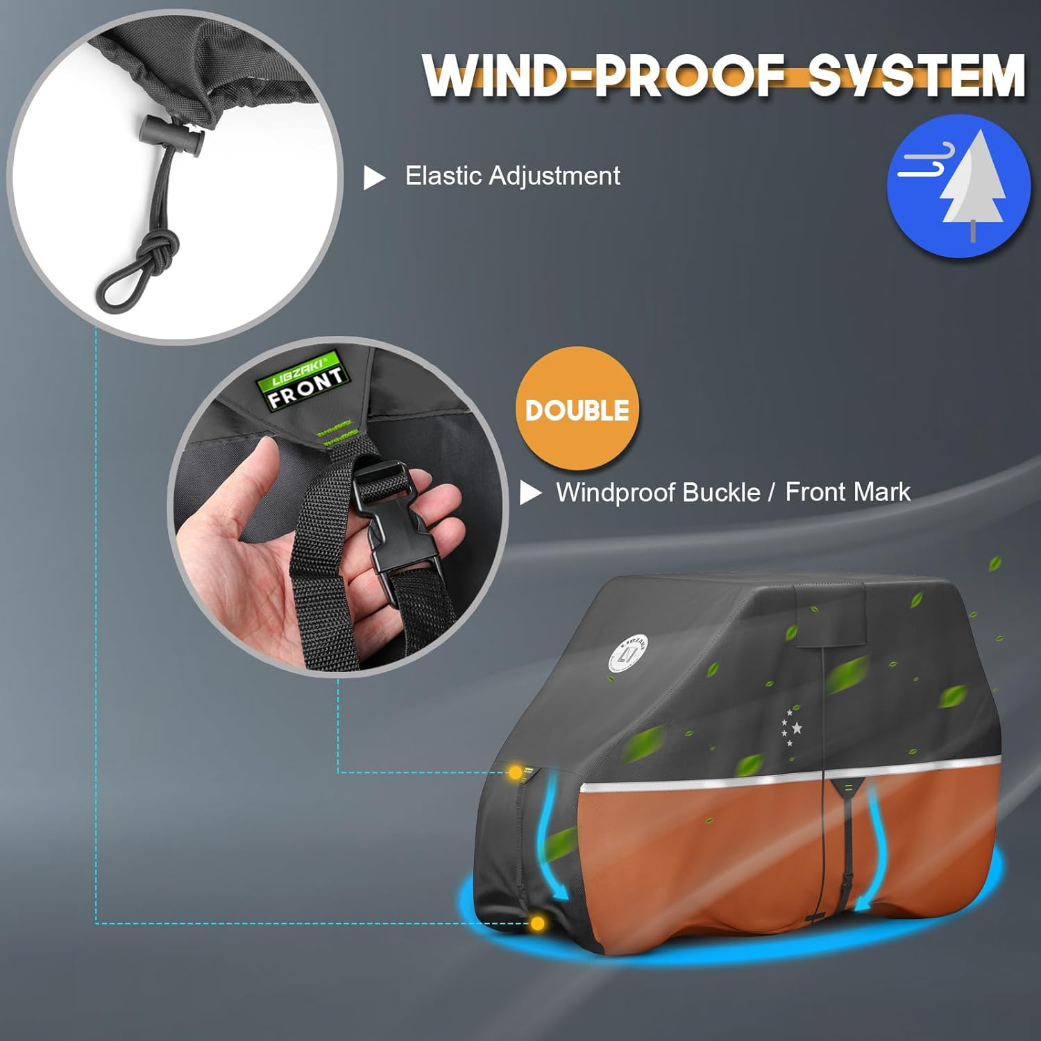 - Unique Exterior Design: ①Clever color matching and wonderful pattern embellishment design,Make your golf car cover stand out. ②Front,rear,left,right has adjustable windproof buckles,Adjustable Hem Cord,all-round windproof. ③Reflective strips on both sides have a night warning effect.