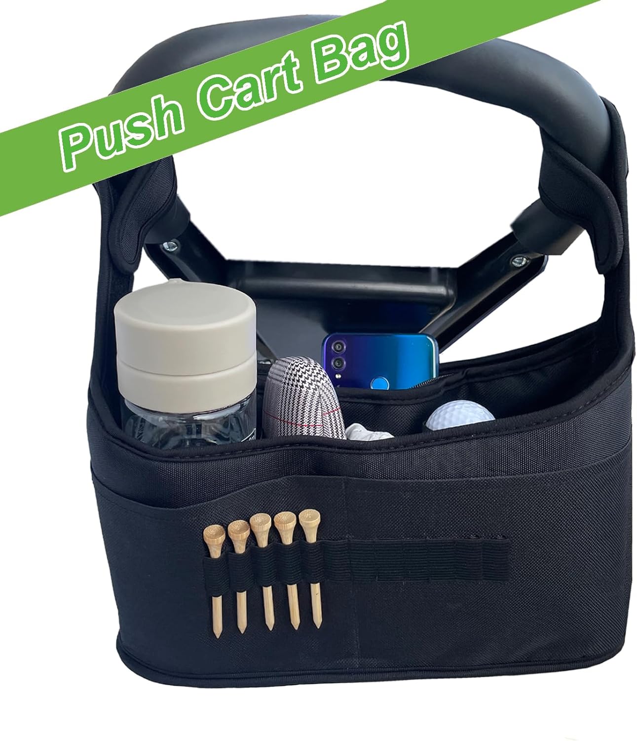 - EXTRA STORAGE SPACE β This Golf Push Cart Accessory Bag is an excellent addition to your push cart, It offers additional space and ensures easy access to your essentials(belongings such as your water bottle, gloves, towel, coat, sunglasses and other golf gear accessories) while on the golf course.