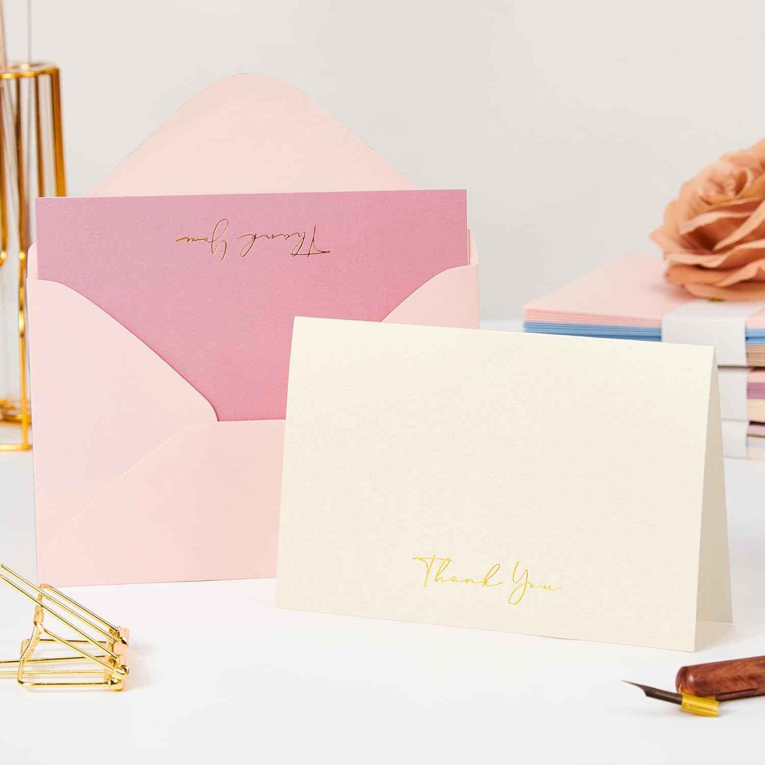 - Elegant Design: Elevate your gratitude with this exquisite set of 4x6 thank you cards with envelopes, featuring five elegant hues. Each thank you card is adorned with luxe gold foil 'thank you' script at the base—a timeless touch for weddings, gifts, or heartfelt notes