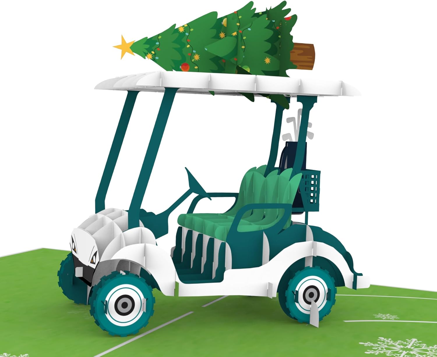 - **Exquisite 3D Pop-Up Golf Cart Design**: The card features an intricately designed golf cart, meticulously crafted to pop up in three dimensions, carrying a fully decorated Christmas tree, adding a playful yet festive touch to your holiday greetings
