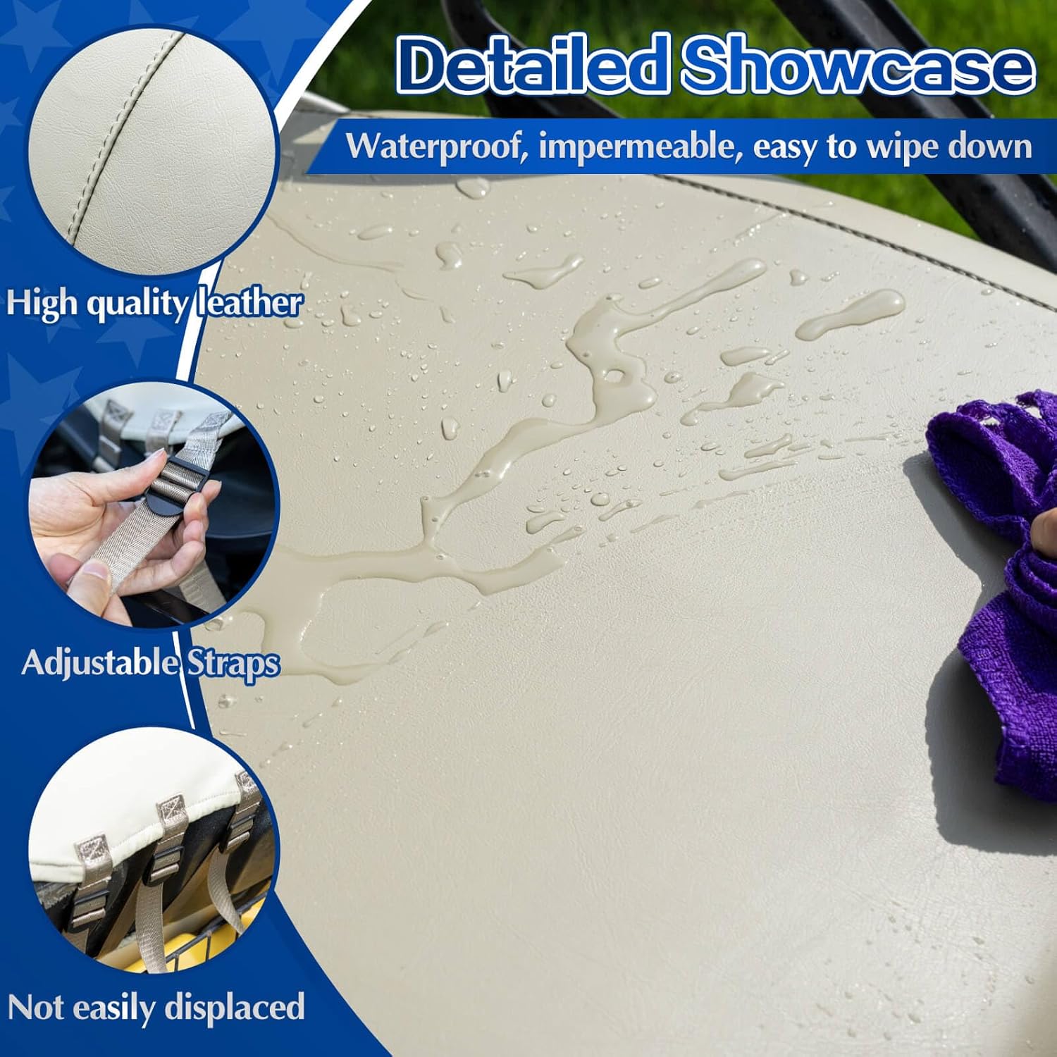 - ăPremium Waterproof Materială The golf cart seat covers are made of durable, high-quality vinyl that resists wear and tear and UV exposure, Waterproof, impermeable, easy to clean.You don't have to worry about fading and cracking