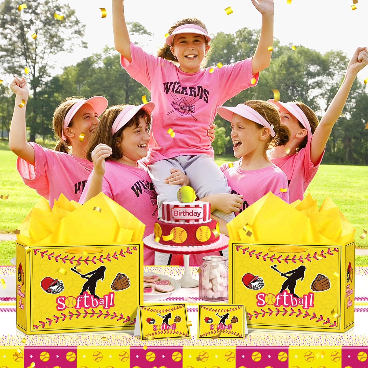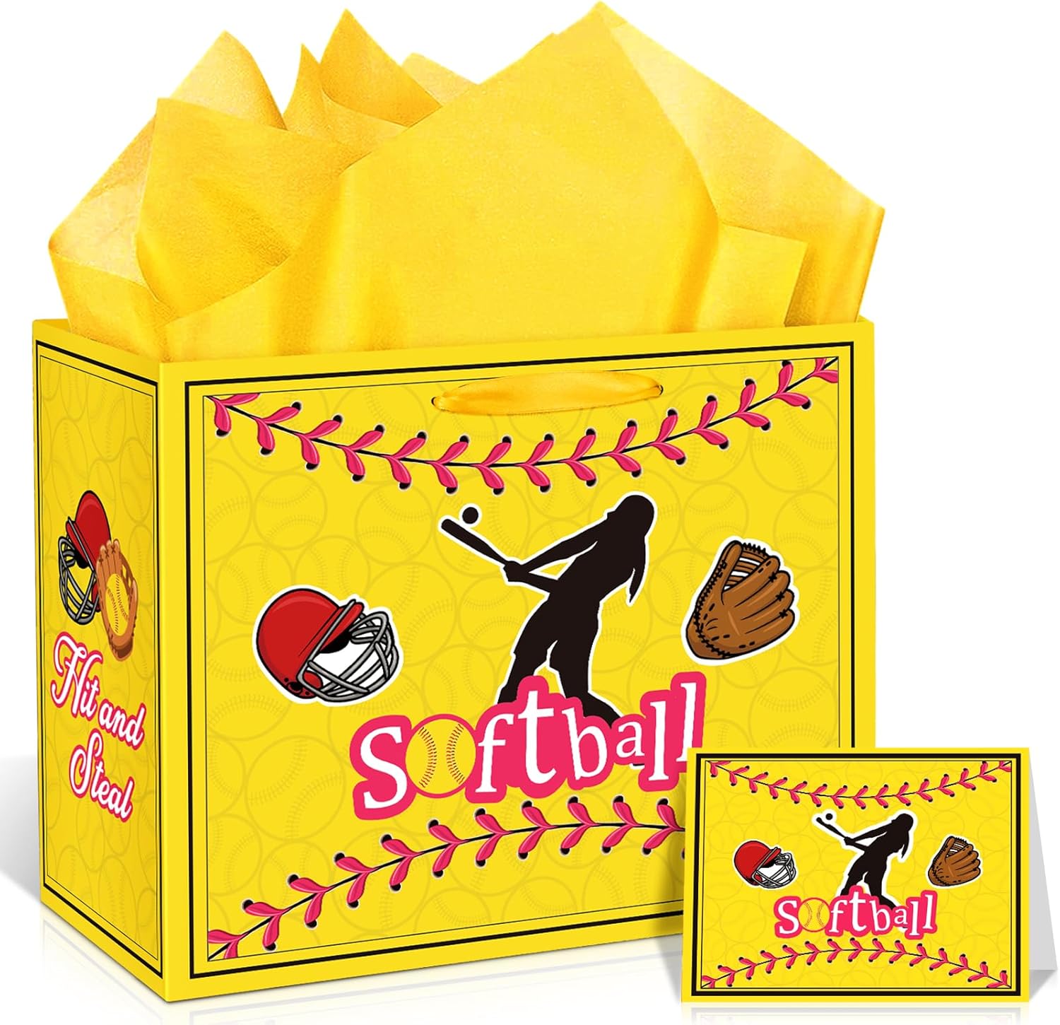 - đ„ăSoftball Gift Bagă: This yellow softball gift bag set includes 1pcs softball gift bag, 1pcs softball greeting card and 3pcs tissue papers.The softball goodie bags features a very shiny and realistic print, which make the softball gifts bag look more full of sport party atmosphere.