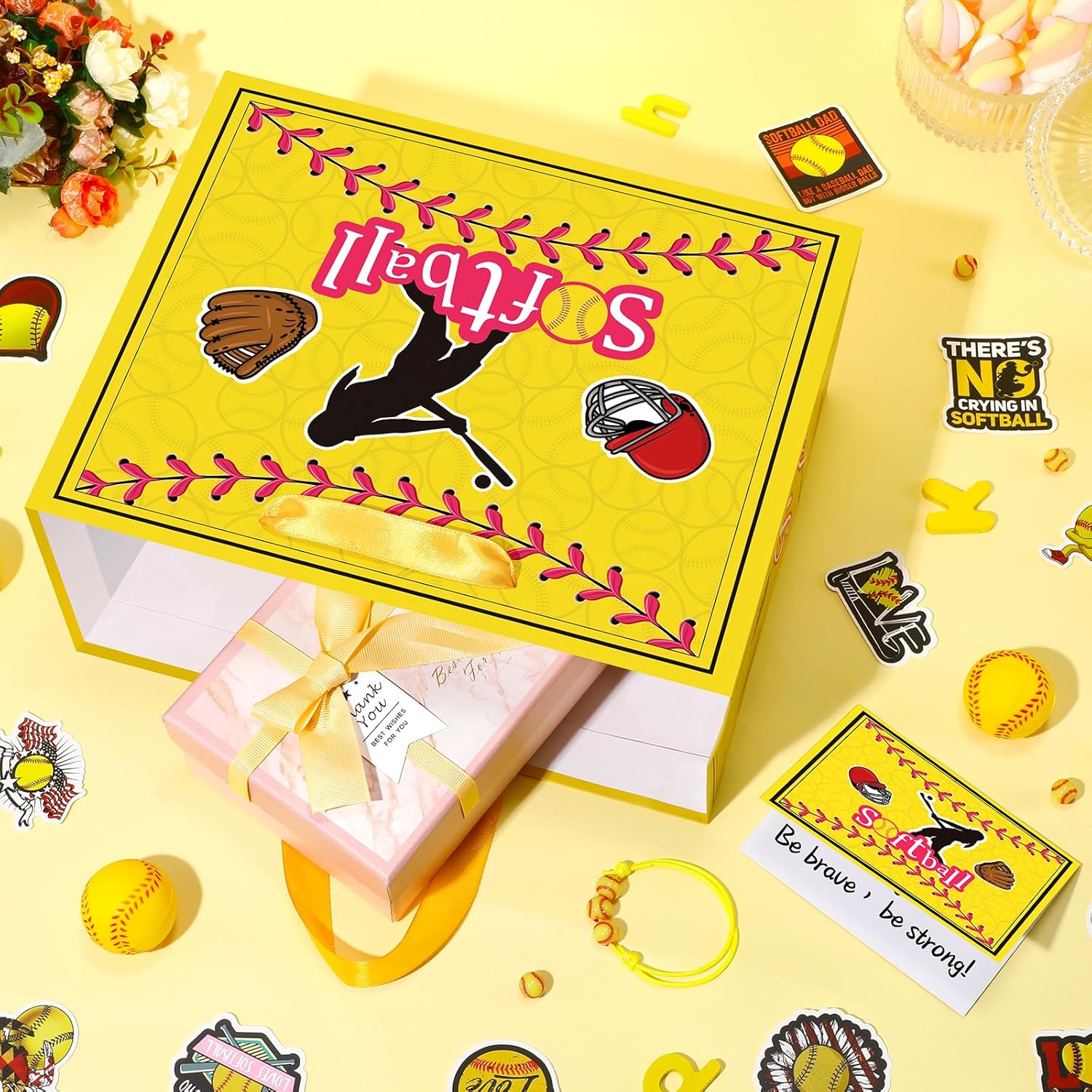 - đ„ăWidely Usedă:The softball gift bag for girls and women for their special day, may it be a birthday, sport event or any special occasion. Large present gift bag with a softball theme and bright yellow color, great as a generous wrapping for tall gifts for any occasions