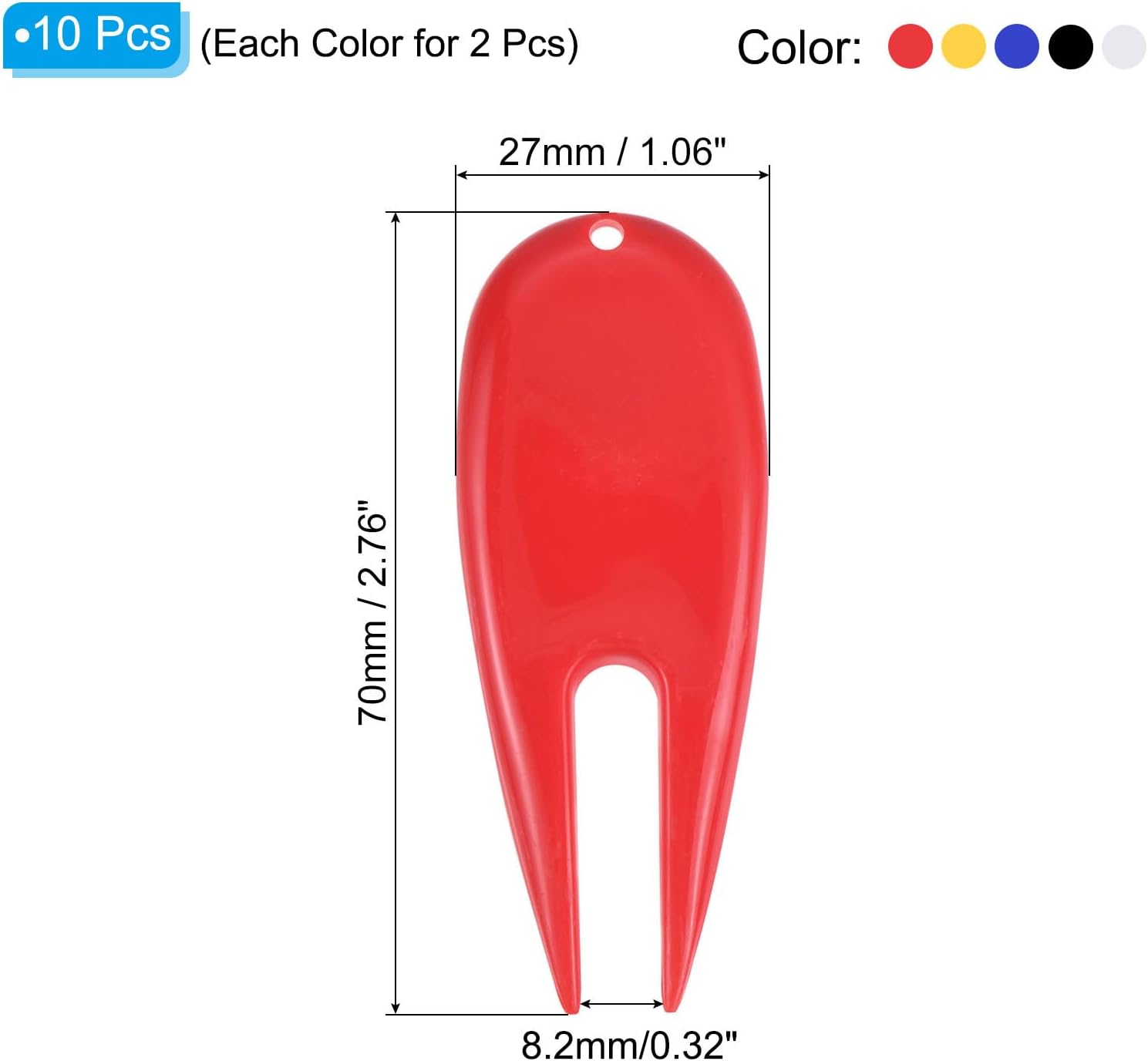 - Material: Plastic; Prong Opening: 8.2mm / 0.32 inch; Overall Size: 70 x 25 x 5mm / 2.76 x 0.98 x 0.19 inch(LxWxThickness); Packing List: 10 x Golf Repair Tools (each colour 2pcs)
