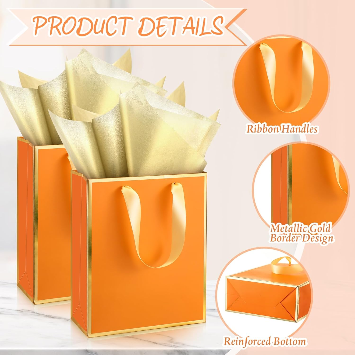Yeaqee 24 Pack Metallic Paper Gift Bags with Handle and Tissue 9x7x3.1 Gold Foil Welcome Favor Bags Return Gifts for Wedding Fall 5 Senses Christmas Bridesmaid Birthday(Orange, Gold)