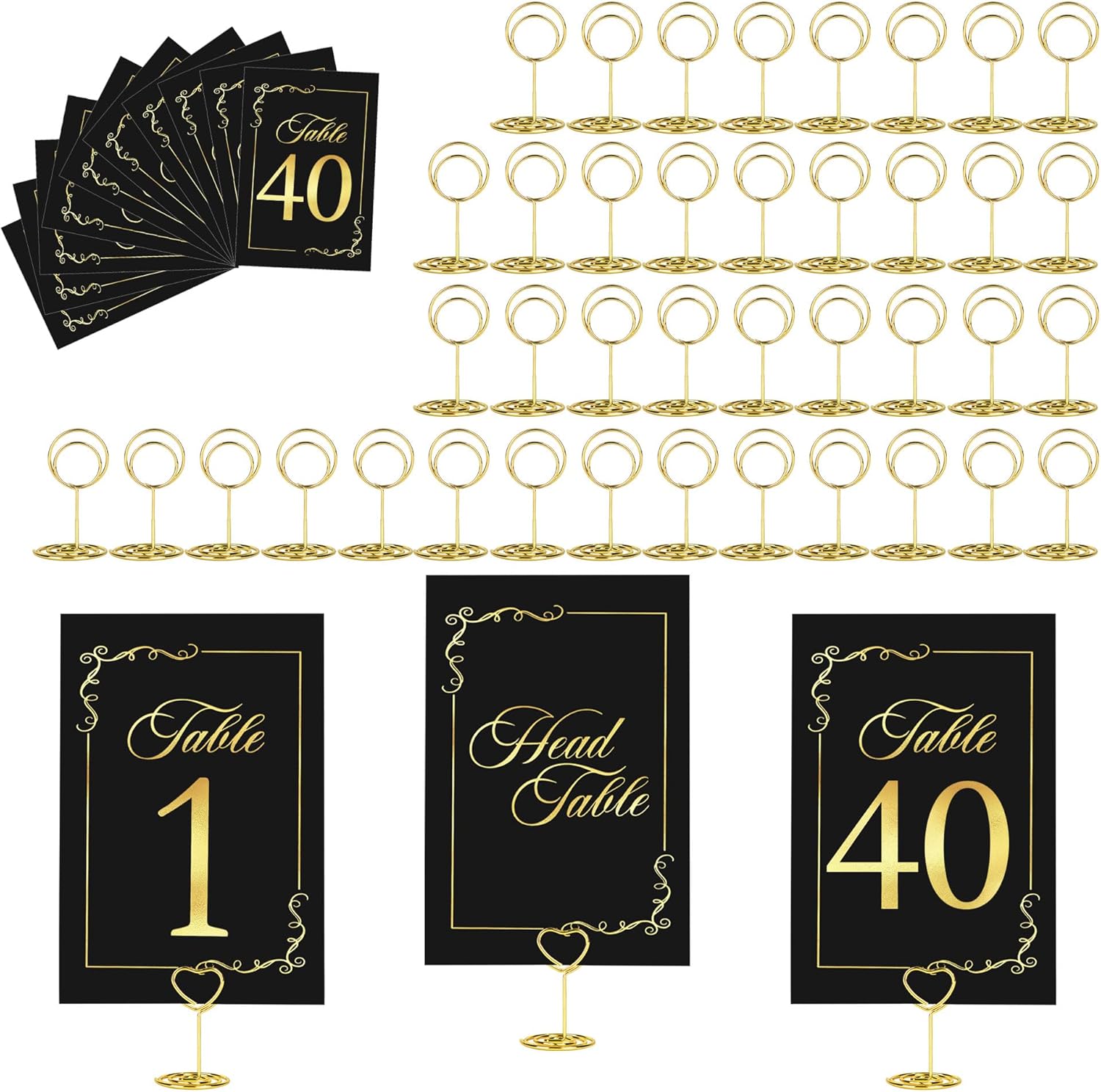 JOYIT 41 Sets Wedding Table Number 1-40 and Head Table Card with 41 Pcs Table Number Holders, Black Gold Table Number Cards with Place Card Holders, 4" X 6" Table Numbers Card for Wedding Reception