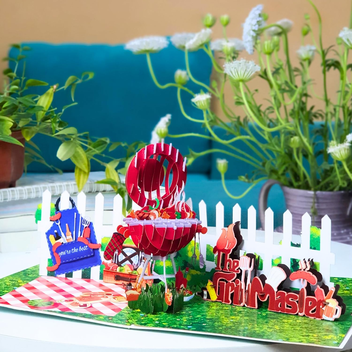 HEARTAGS- Pop Up Birthday Card for Men, Master Grill Birthday Card For Dad, Husband, Brother, Son, Grandpa, BBQ 3D Popup Greeting Cards Size 6x8 inches Includes Message Note and Envelop