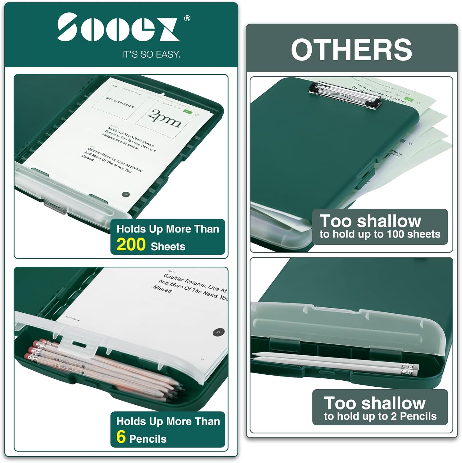 - High Capacity: Equipped with both a paper storage component that holds twice as much paper as other clipboards and a built-in pencil case. The high-capacity medical clipboard can securely hold up more than 200 letter-sized documents, and up to 6 pencils.