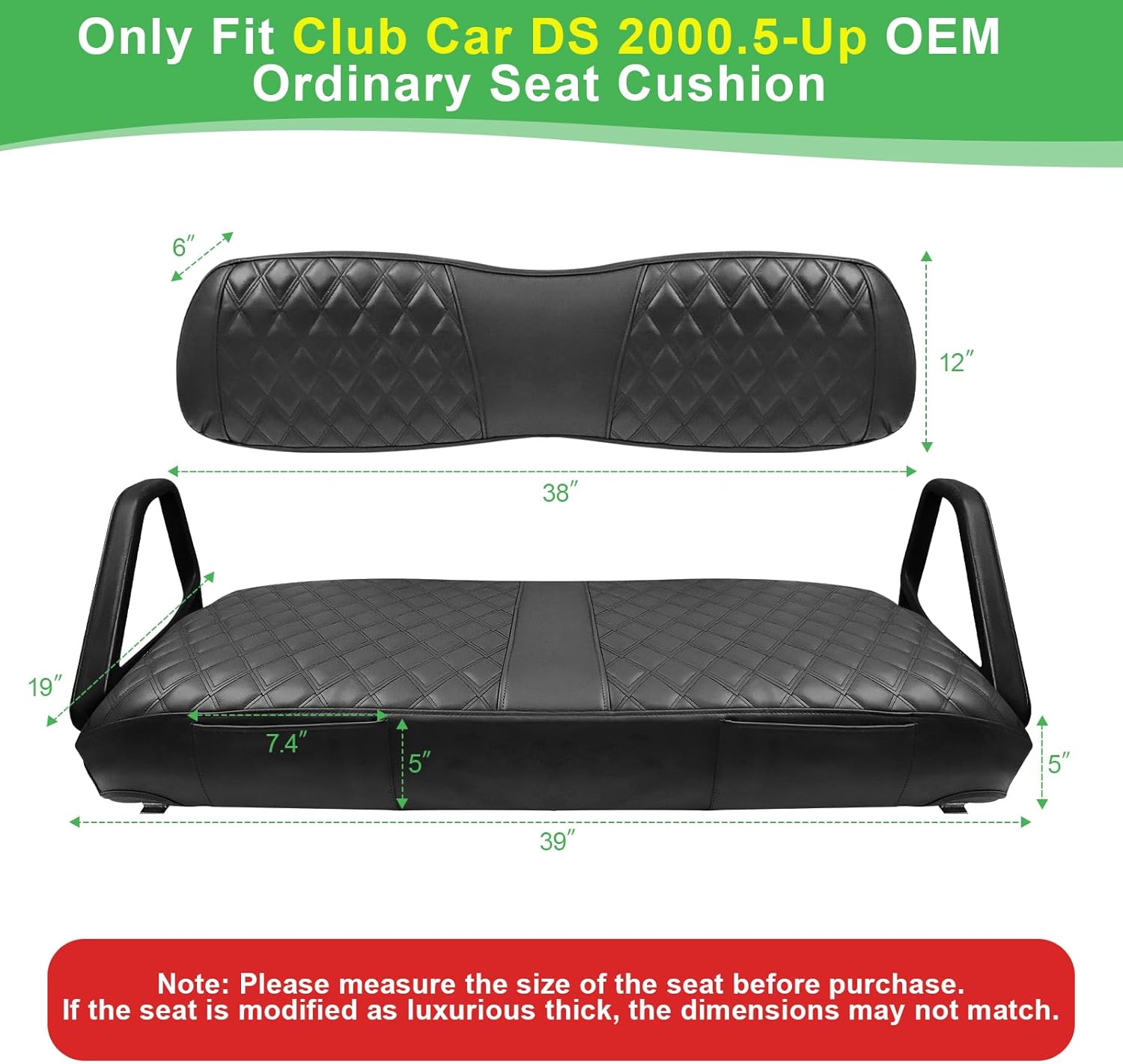 - Fit Models: Golf cart seat covers fit Club Car DS 2000.5-Up front OEM ordinary seats only. This Club Car seat covers kit contains 1 front backrest cover (about 38 X 12 X 6 inches) and 1 front bench seat cover (about 39 X 19 X 5 inches). Note: NOT fit luxurious thick cushions, NOT fit rear seat