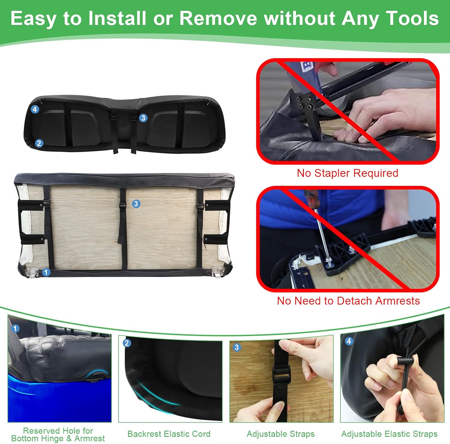 - Simplified Setup: This club car ds 2000.5-current front seat cover is designed for hassle-free installation, requiring no tools or the removal of armrests. The inclusion of straps ensures a smooth installation process, eliminating the need for nails or the removal of the existing vinyl seat cover. Simply drape the cover over your old seat, and with the adjustable shoulder straps and retractable buckles, you can install or remove the seat cover in a matter of minutes
