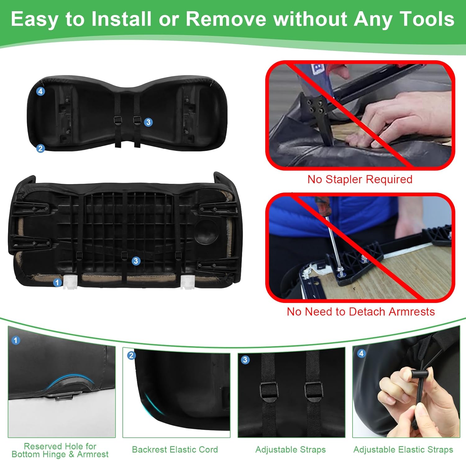 - Simplified Setup: This yamaha front seat cover is designed for hassle-free installation, requiring no tools or the removal of armrests. The inclusion of straps ensures a smooth installation process, eliminating the need for nails or the removal of the existing vinyl seat cover. Simply drape the cover over your old seat, and with the adjustable shoulder straps and retractable buckles, you can install or remove the seat cover in a matter of minutes